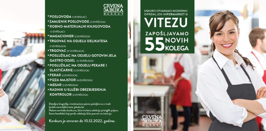 U novoizgrađenom trgovačkom centru u središtu Viteza M&D City (zgrada nekadađnjeg Hotela Vitez) lanac trgovina Crvena jabuka market uskoro otavra svoja vrata. Tim povodm raspisali su natječaj za prijam u radni odnos 55 djelatnika.