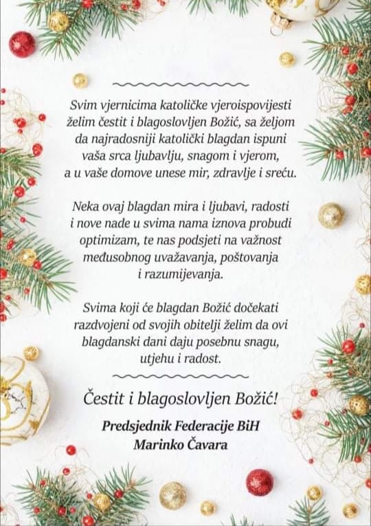 „Svim vjernicima katoličke vjeroispovijesti želim čestit i blagoslovljen Božić, sa željom da najradosniji katolički blagdan ispuni vaša srca ljubavlju, snagom i vjerom, a u vaše domove unese mir, zdravlje i sreću.