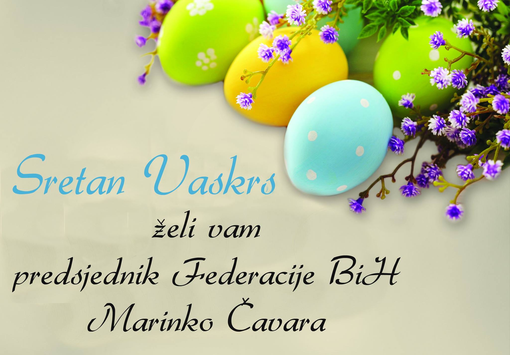 “Svim vjernicima želim sretan i blagoslovljen blagdan Uskrsa i Vaskrsa. Neka ovaj blagdan bude poticaj za jaču vjeru u nadi uskrsnuća i neka unese radost i snagu za sretan život u ljubavi prema bližnjima s većom tolerancijom i solidarnošću.” navodi se u čestitci predsjednika Federacije BiH Marinka Čavare.
