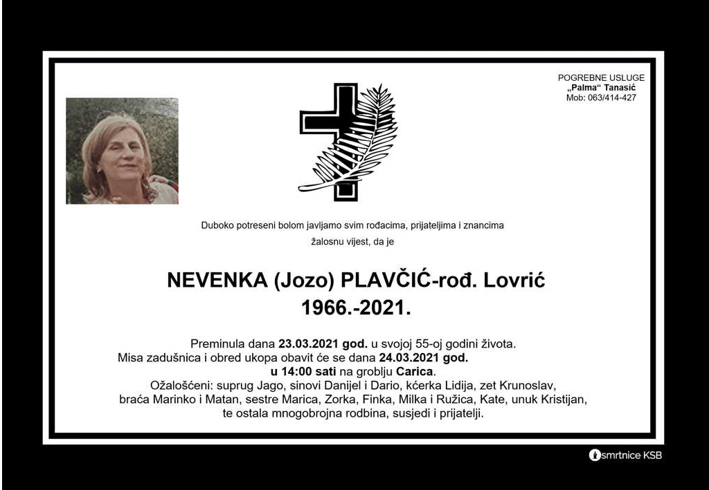 U 55. godini života napustila nas je naša sugrađanka, Nevenka Plavčić, rođ. Lovrić.