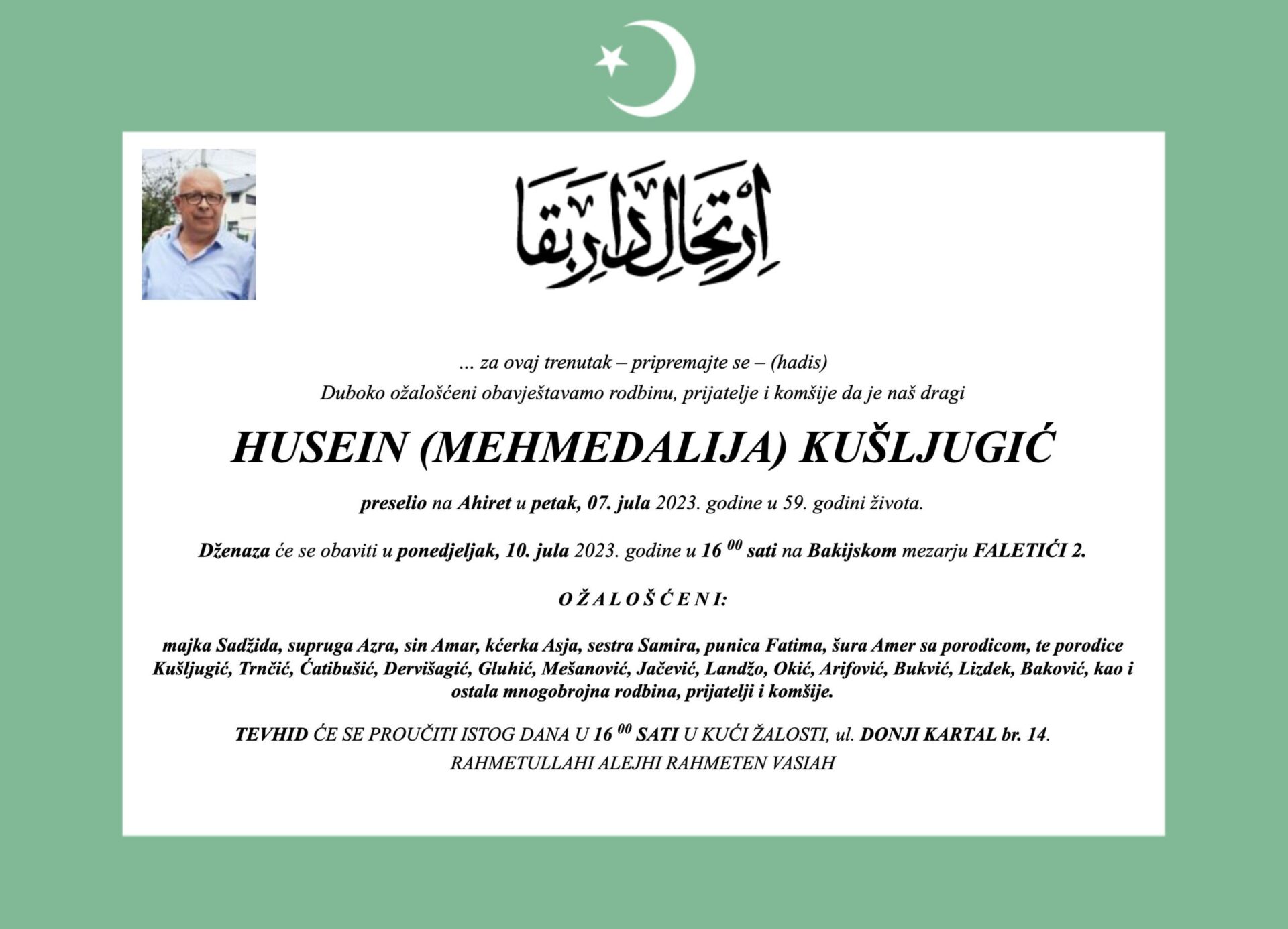 Doktorova dženaza bit će održana u ponedjeljak, 10. srpnja 2023. godine, u 16 sati na Bakijskom mezarju Faletići 2, gdje će se prijatelji i obitelj oprostiti od njega.