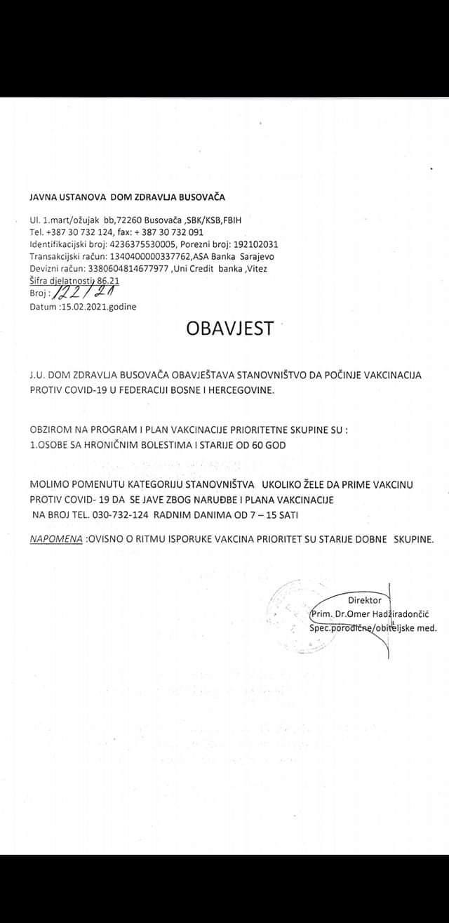 J.U. Dom zdravlja Busovača obavještava stanovništvo da počinje vakcinacija protiv Covid-19 u Federaciji Bosne i Hercegovine.