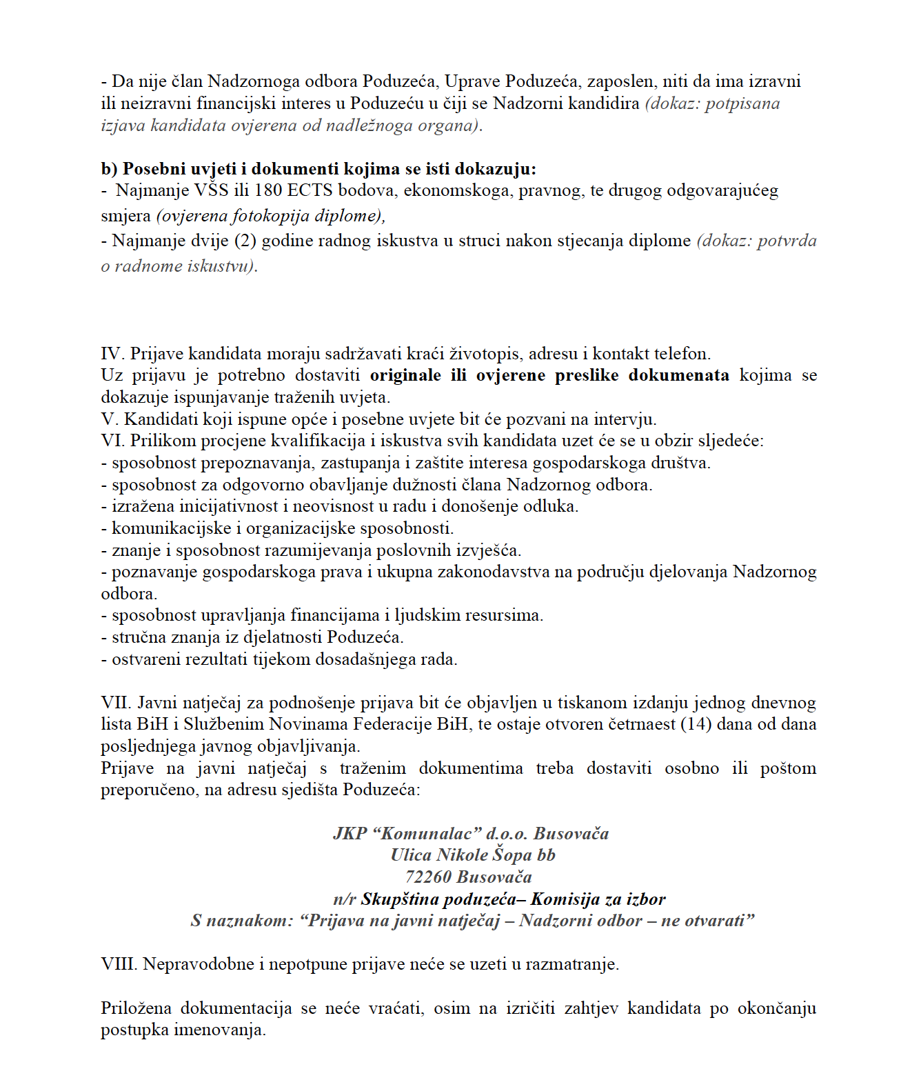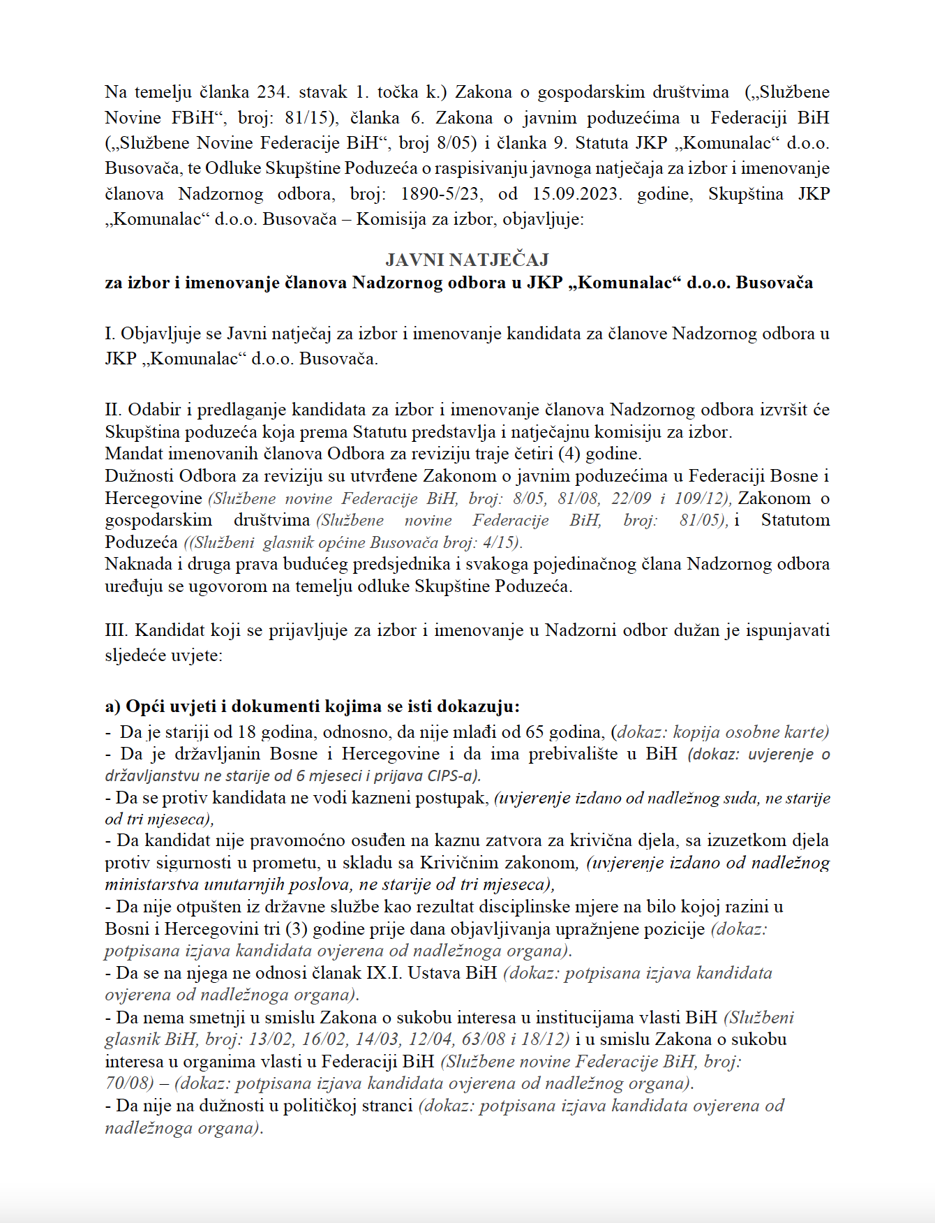 JAVNI NATJEČAJ ZA IZBOR I IMENOVANJE ČLANOVA NADZORNOG ODBORA JKP “KOMUNALAC” d.o.o. BUSOVAČA