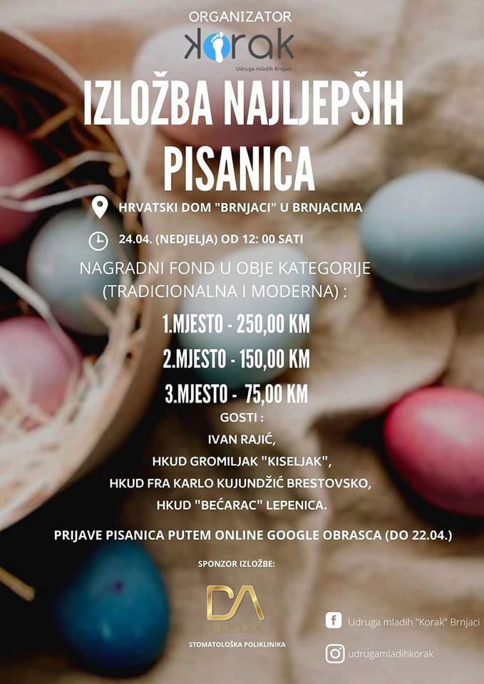U nedjelju, 24. travnja 2022. godine s početkom u 12:00 sati u Hrvatskom domu “Brnjaci” u Brnjacima bit će upriličena IZLOŽBA NAJLJEPŠIH PISANICA u organizaciji Udruga mladih “Korak” Brnjaci‼️