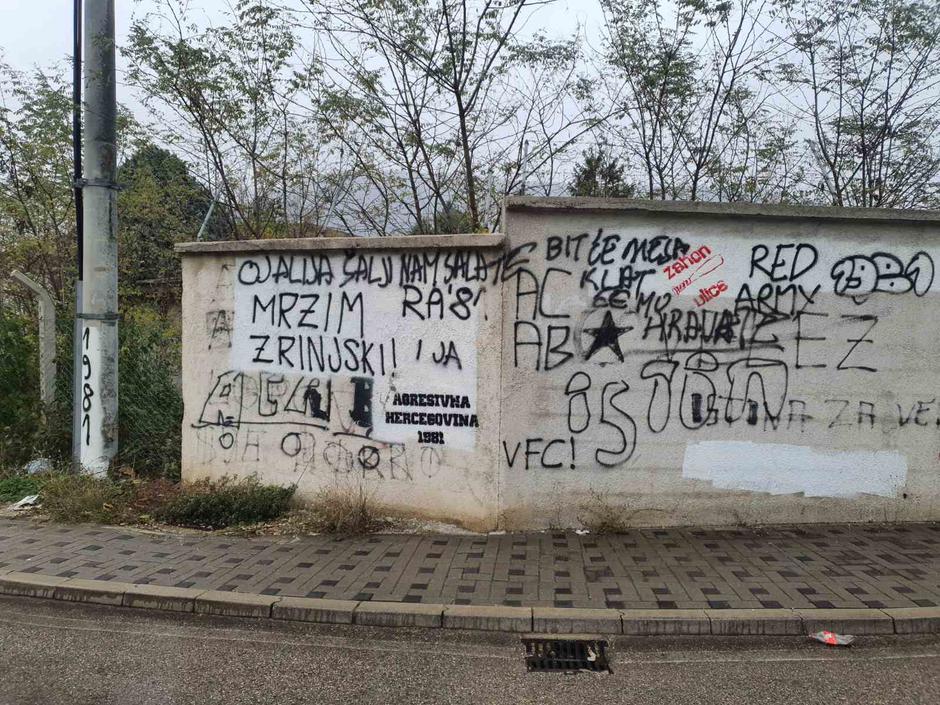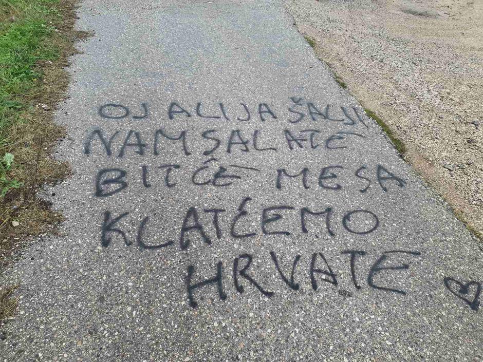 Sinoć između 21.00 i 22.00 sati nepoznati počinitelji ispisali su na prometnici koja vodi u naselje Mikulića mahala prijeteći grafit “Oj Alija šalji nam salate, bit će mesa klat ćemo Hrvate”.