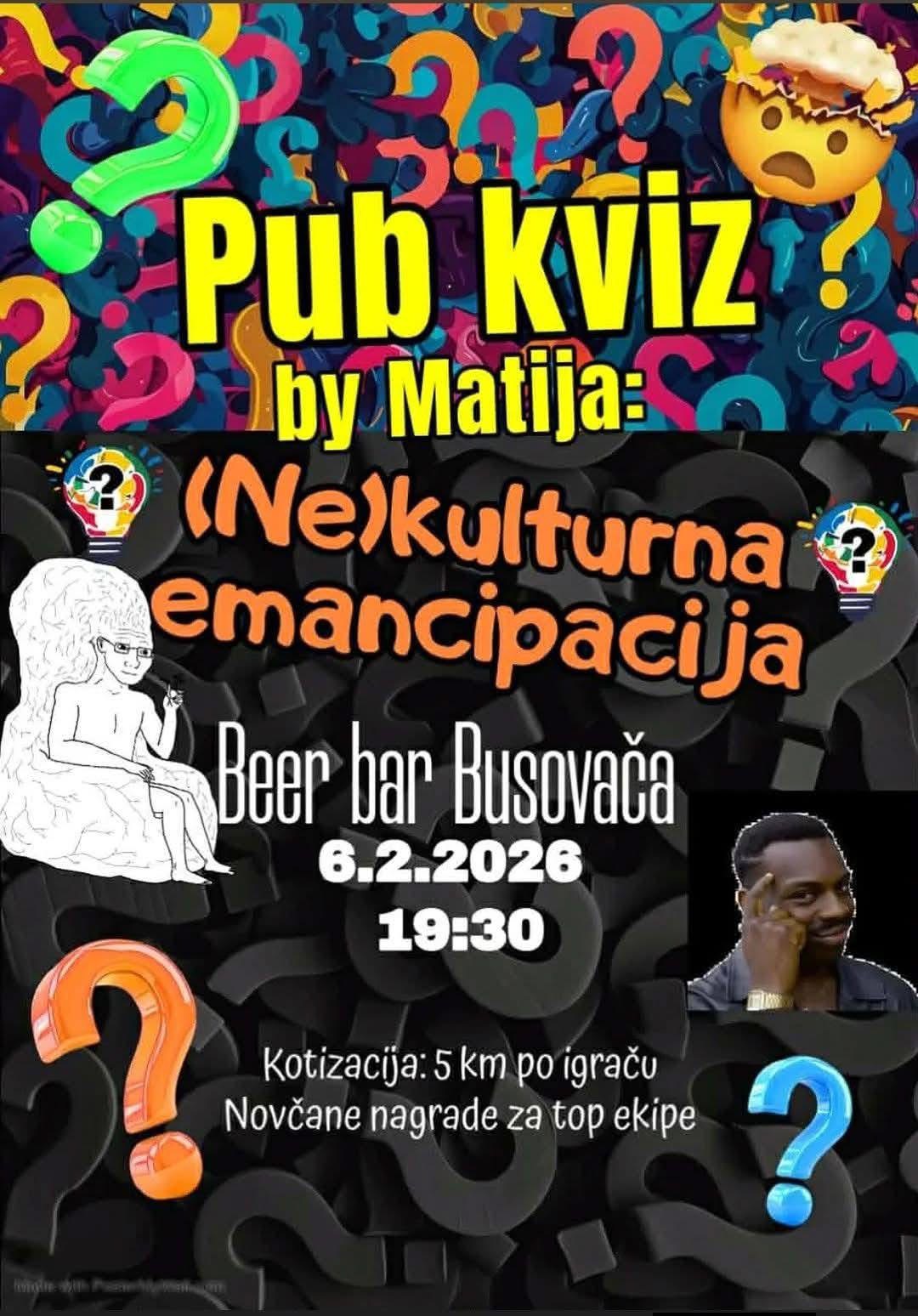 Kviz je zakazan za 6. veljače 2026. godine s početkom u 19:30 sati, a organizira ga „Pub kviz by Matija“. Sudionici će imati priliku okušati se u raznim pitanjima te provesti večer u natjecateljskom, ali opuštenom druženju.