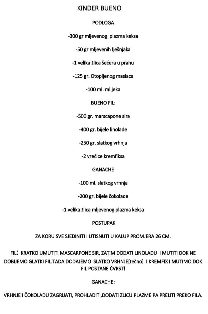 Ovaj tjedan donosimo vam recept super brze i jednostavne kinder bueno torte! Osnovni recept je s Instagram profila “slatkadomacica”, a današnji koji objavljujemo sadrži nekoliko izmjena. Torta se vrlo brzo napravi, ukusna je i nije potrebno pečenje.