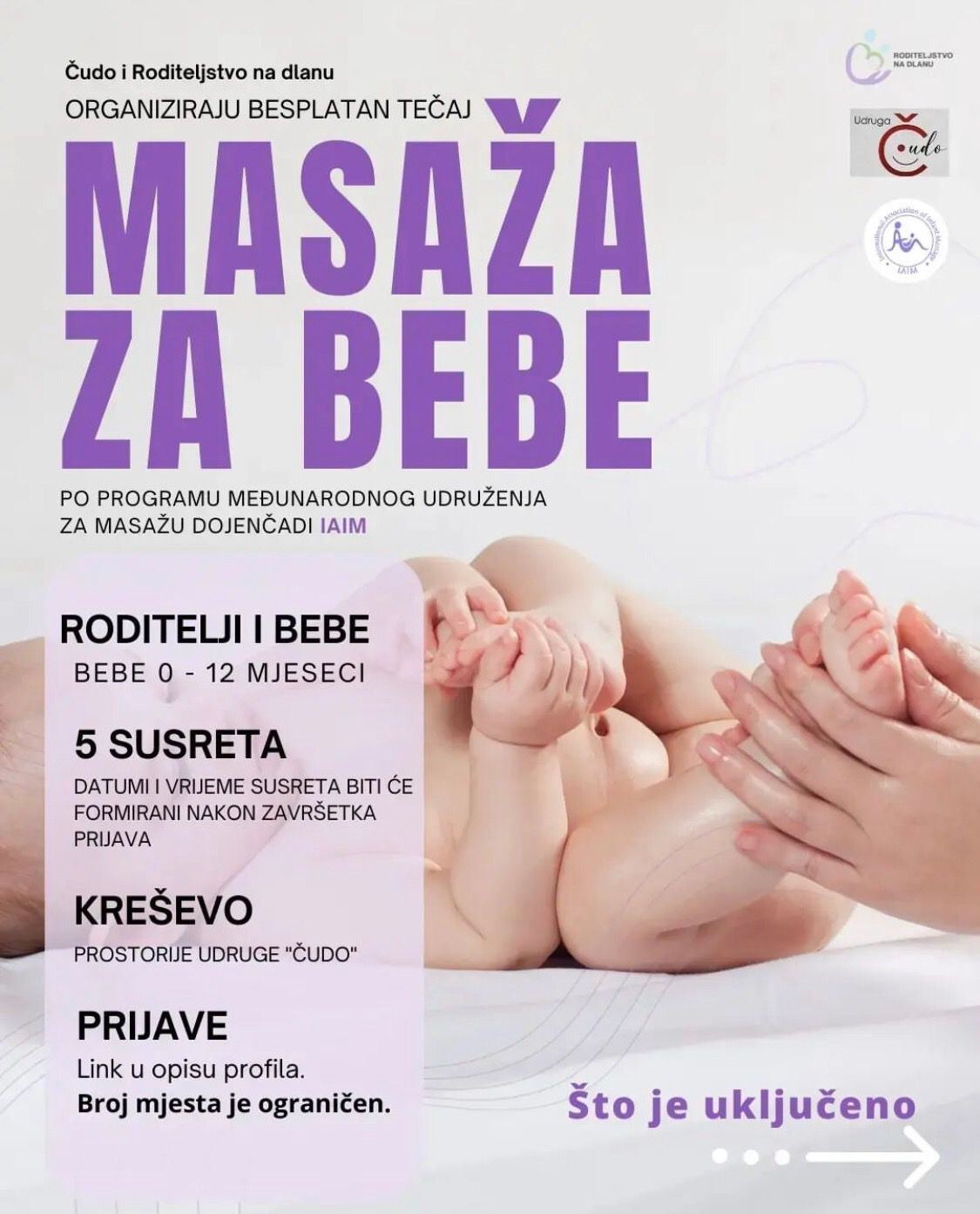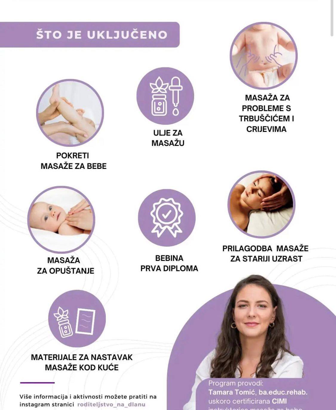Individualno i grupno provodi jedinstveni program obuke roditelja Međunarodne asocijacije za masažu beba IAIM, gde roditelji uče kako masirati svoje bebe.
