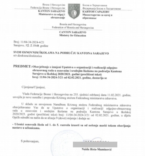 Odluka je to Ministarstva za odgoj i obrazovanje Kantona Sarajevo, a donesena je nakon što je Vlada Federacije Bosne i Hercegovine usvojila nove naredbe i preporuke Kriznog štaba Federalnog ministarstva zdravstva.