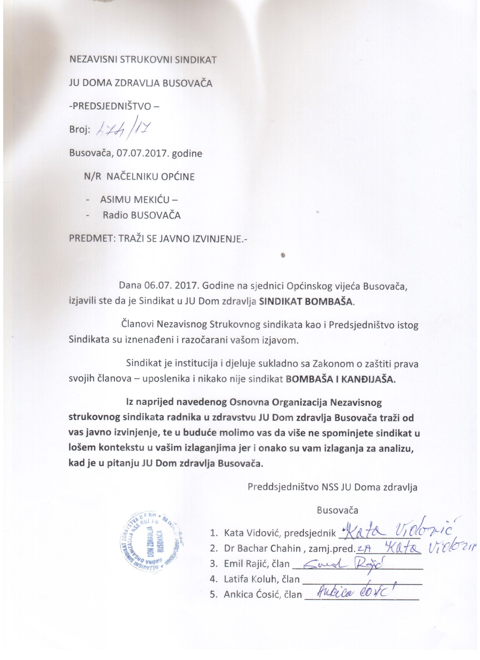 U petak, 7. srpnja 2017. godine, u našu redakciju pristigao je dopis Nezavisnog strukovnog sindikata JU Dom zdravlja Busovača. Dopis prenosimo u cijelosti: