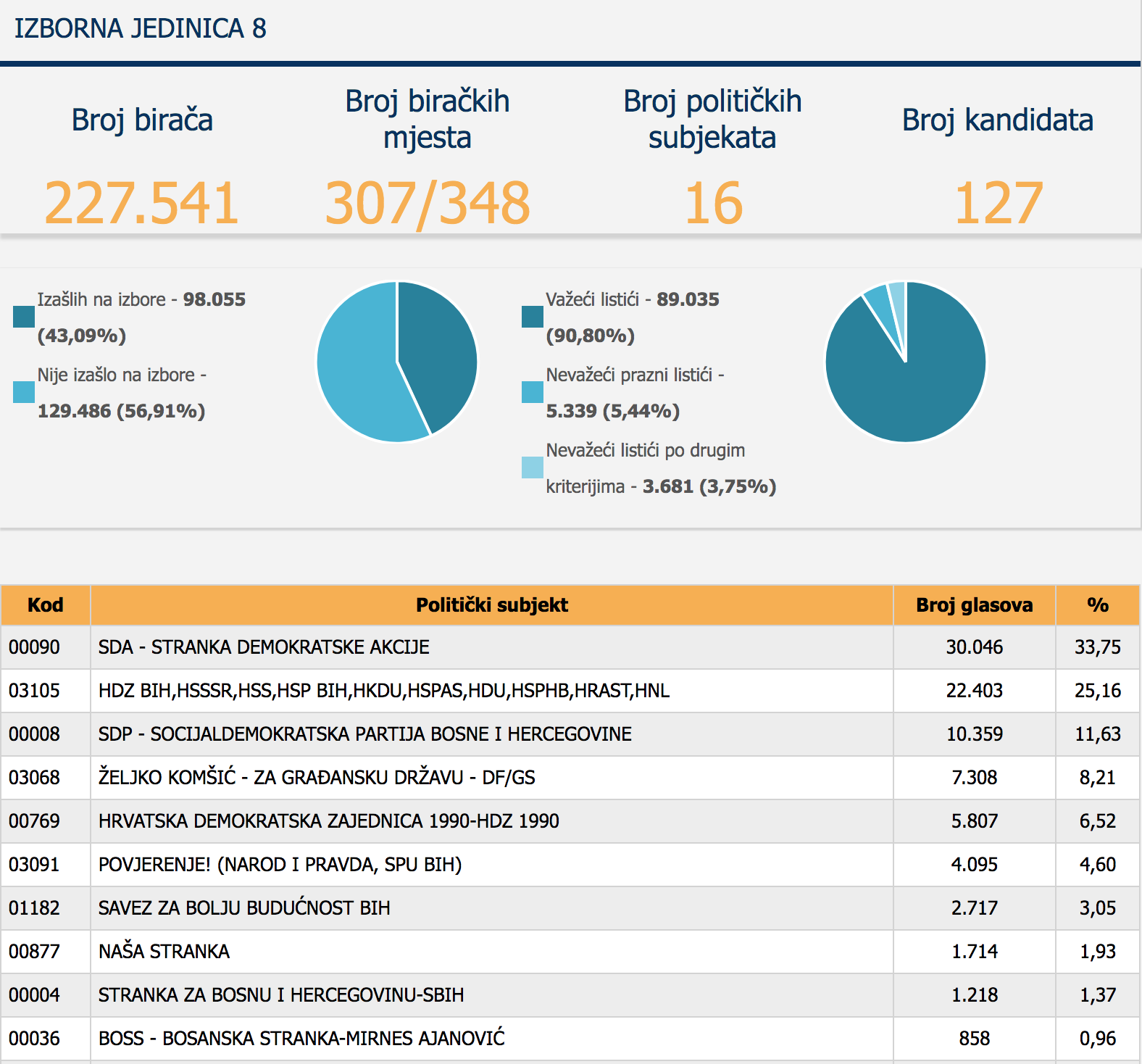 Središnje izborno povjerenstvo BiH se ‘probudilo’ pa je u posljednjih pola sata objavilo rezultate za razinu Federacije BiH. Obrađeno je 43,09% odnosno 98.055 glasova. Najviše su dobile dvije dame – Lidija Bradara (HDZ BIH) i Melika Mahmutbegović (SDA). Dobar rezultat bilježi i Mirjana Plavčić iz Busovače.