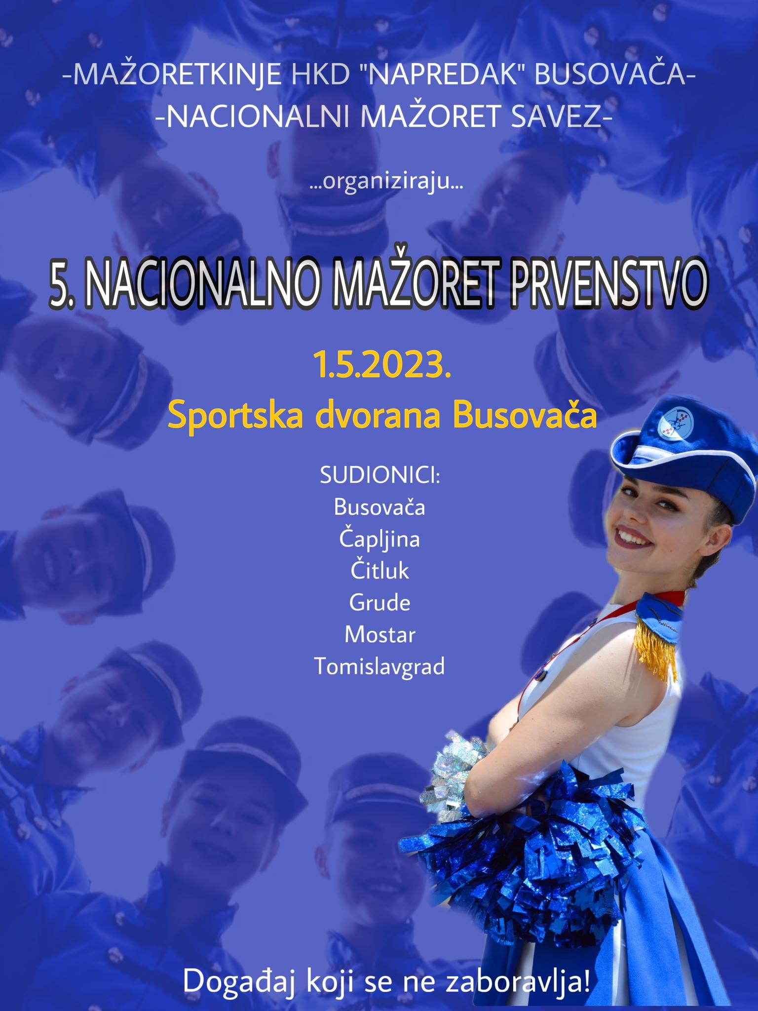 Sutra, 1. svibnja s početkom u 10:00 sati u Sportskoj dvorani Busovača sastat će se preko 300 mažoretkinja iz Busovače, Čapljine, Čitluka, Gruda, Mostara i Tomislavgrada kako bi svoje vještine pokazale pred licenciranim sucima i publikom na jedinom mažoret prvenstvu u BiH.