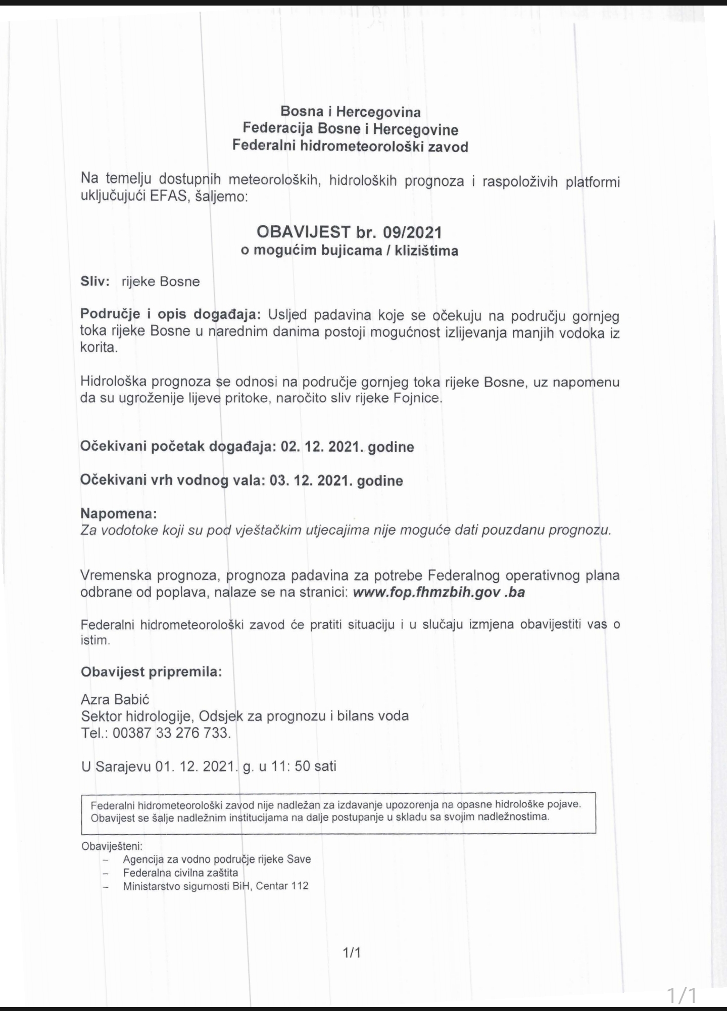 Federalni hidrometeorološki zavod na temelju dostupnih meteoroloških, hidroloških prognoza i raspoloživih platformi uključujući EFAS, za sutra i prekosutra najavljuje moguće bujične poplave na pritokama na području gornjeg toka rijeke Bosne.