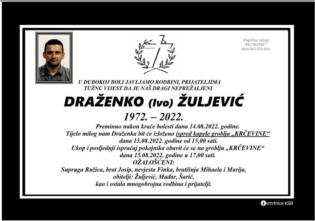 U nedjelju 14. kolovoza 2022. godine u 50. godini života preminuo je Krčevljanin Draženko Žuljević. Inače, Draženko je rođen 2. travnja 1972. godine i bio je zaposlenik Ministarstva unutarnjih poslova ŽSB PS Vitez. Pokojni Žuljević bolovao je od teške bolesti koja je za kratko vrijeme uznapredovala, javlja viteski.ba.
