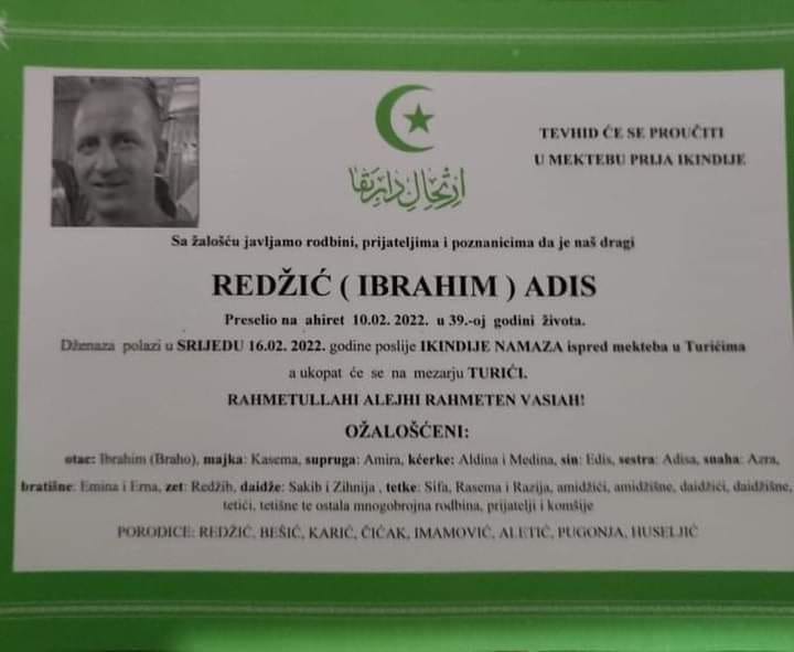 Dženaza tragično preminulom Adisu bit će klanjana sutra, 16. 2., poslije ikindije namaza, u selu Turići, gdje je Adis rođen i odrastao.