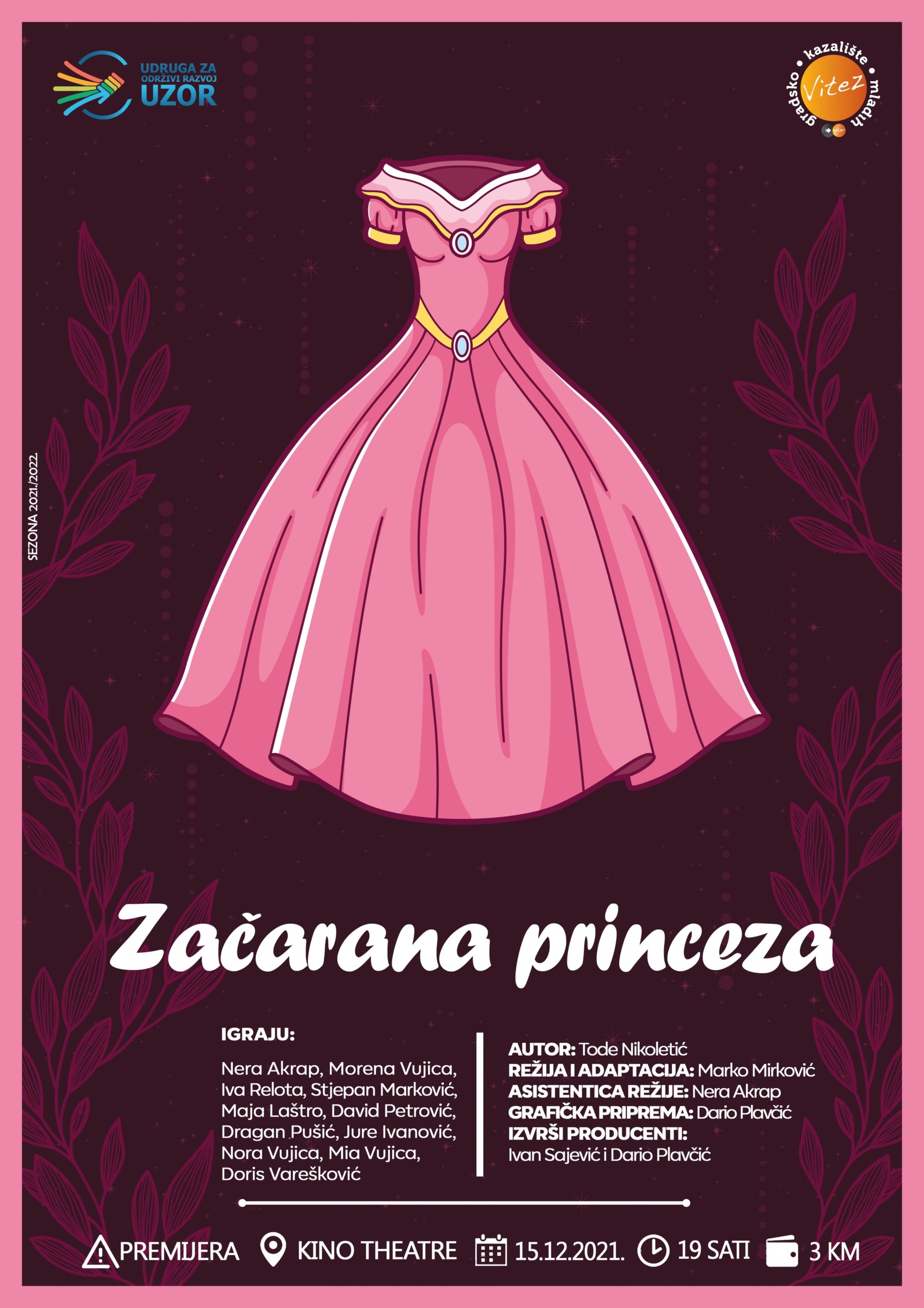 “Pred sami kraj godine našoj publici smo pripremili još jednu premijeru u kojoj će najprije uživati svi bajkoljupci, mališani, mladi, ali svakako i odrasli s obzirom da se radi o jednoj neobičnoj bajci. Vjerujemo kako će publika i ovaj put uživati u našem novom kazališnom činu u kojem se naši najmlađi igraju na sceni i žive jako zanimljive likove na kojim su vrijedno radili u protekloj godini. Mnogo igre i snažna poruka koju nosi predstava, sigurno nikog neće ostaviti ravnodušnim. Stoga, pozivamo sve, 15. prosinca u Kino Theatre u Busovači, s početkom u 19h. Naša nova premijera, Začarana princeza!“