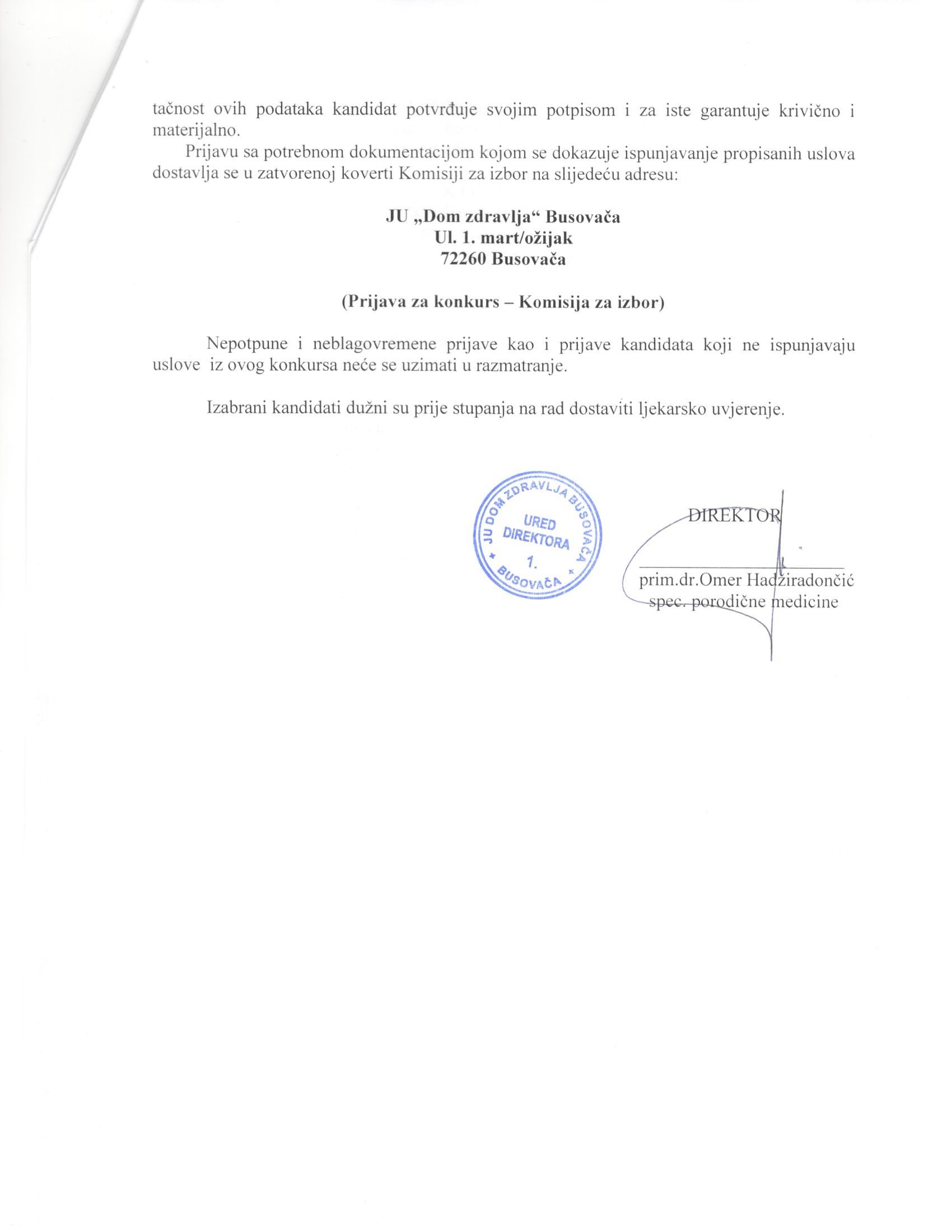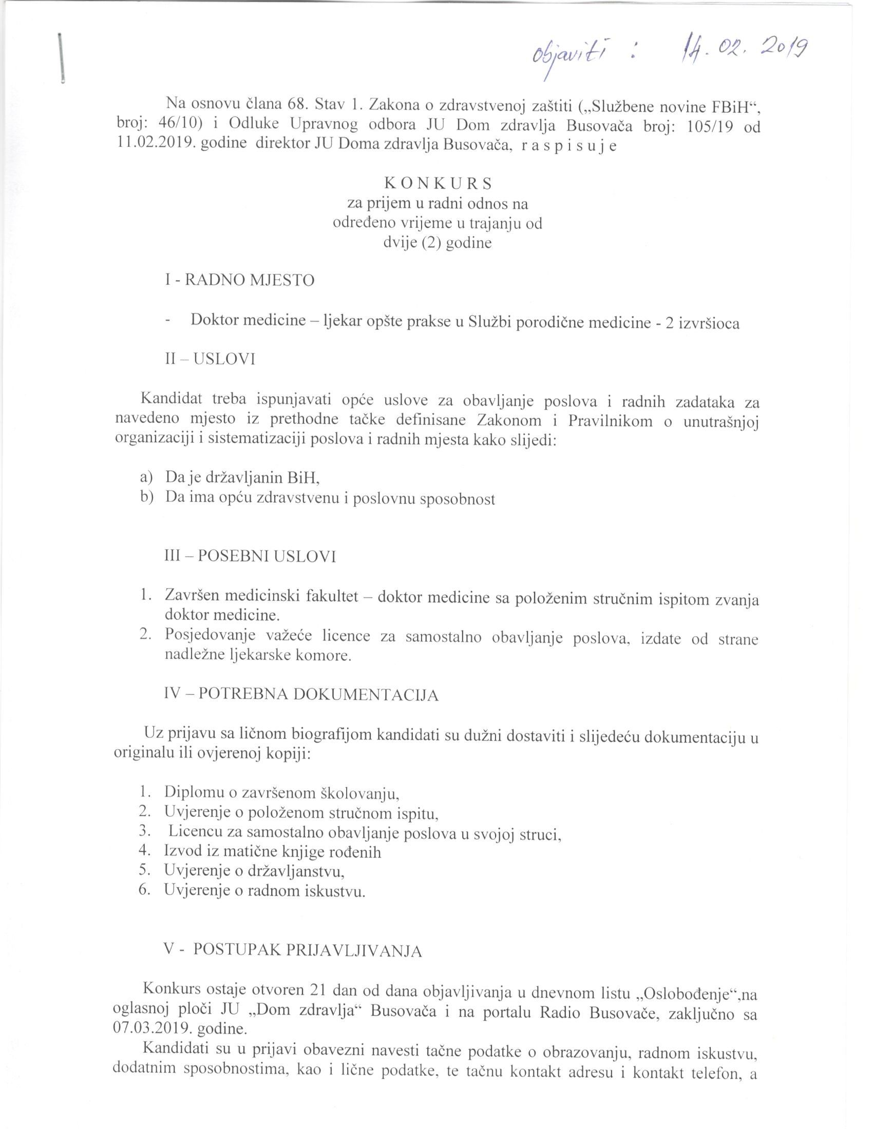 Na osnovu člana 68. Stav 1. Zakona o zdravstvenoj zaštiti („Službene novine FBiH“, broj: 46/10) i Odluke Upravnog odbora JU Dom zdravlja Busovača broj: 105/19 od 11.02.2019. godine direktor JU Doma zdravlja Busovača, r a s p i s u j e