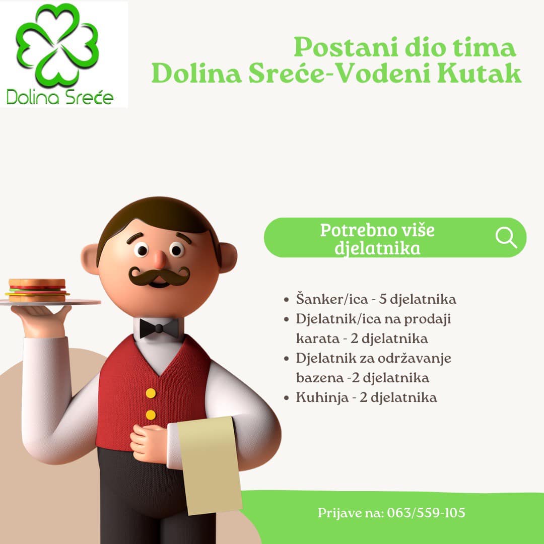 Ako ste komunikativni, volite rad s ljudima i dinamično okruženje svoj CV možete poslati u inbox profila ili donijeti na recepciju u Etno selo Dolina Sreće!