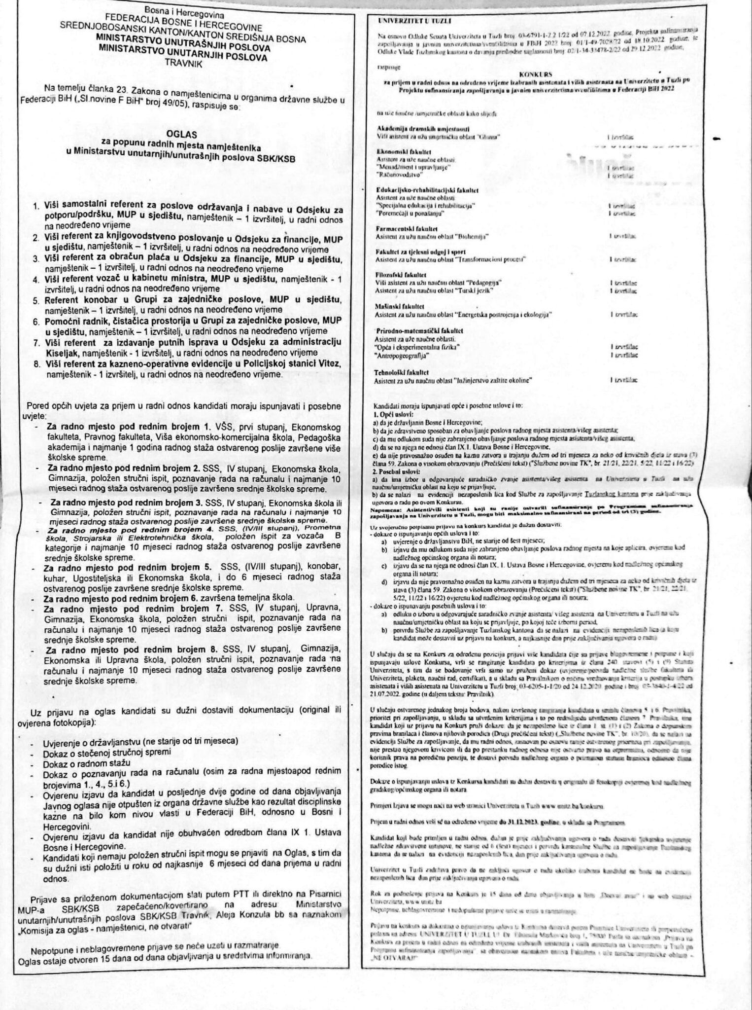 Ministarstvo unutarnjih poslova Županije Središnja Bosna raspisalo je Oglas za popunu više radnih mjesta namještenika u MUP-u.