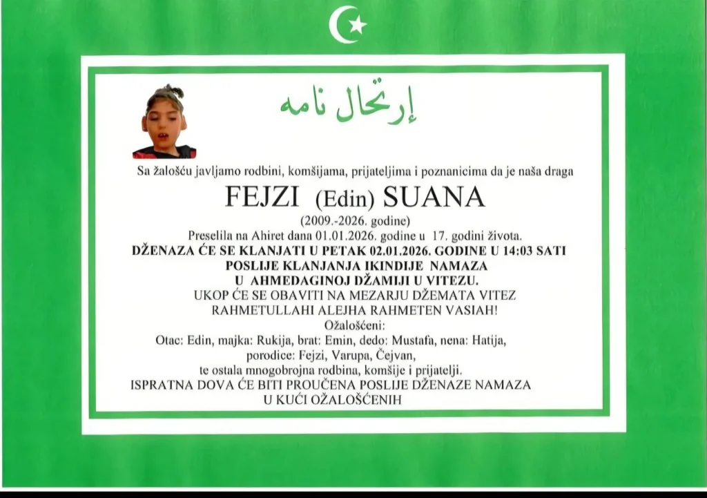 S tugom obavještavamo javnost da je preminula Fejzi (Edin) Suana (2009. – 2026.), u 17. godini života, javio je jutros Medžlis islamske zajednice Vitez.