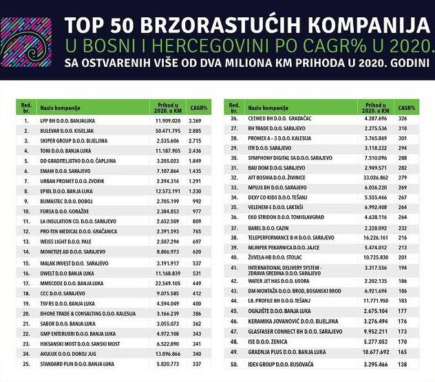 Podaci su ovo koje su realizacijom projekta “Brzorastuće tvrtke u BiH” dobile Poslovne novine i bonitetna agencija LRC. Pri izradi ove liste imali su nekoliko strogih kriterija koje su firme morale ispuniti, poput onih o rastu prihoda u posljednje tri godine, toga da su smanjivale broj zaposlenih te da su imale pozitivnu dobit i veću prosječnu godišnju stopu rasta od 10 posto. Ovaj put, kao referentne godine uzeli su prihode iz tri posljednja financijska izvještaja i to za 2018., 2019. i 2020. godinu.