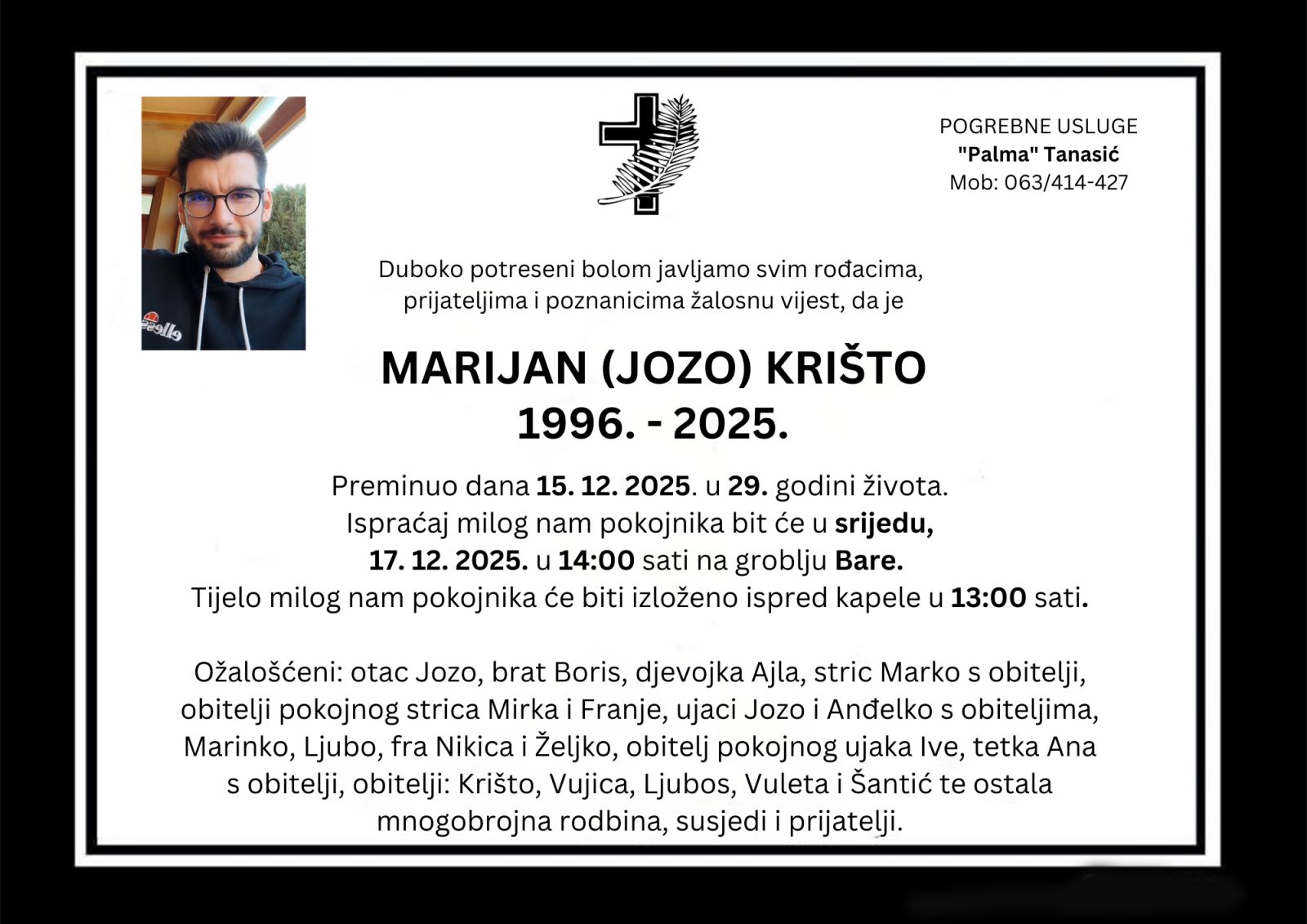 Duboko potreseni bolom javljamo svim rođacima, prijateljima i poznanicima žalosnu vijest, da je MARIJAN (JOZO) KRIŠTO 1996. – 2025. preminuo dana 15. 12. 2025. u 29. godini života.