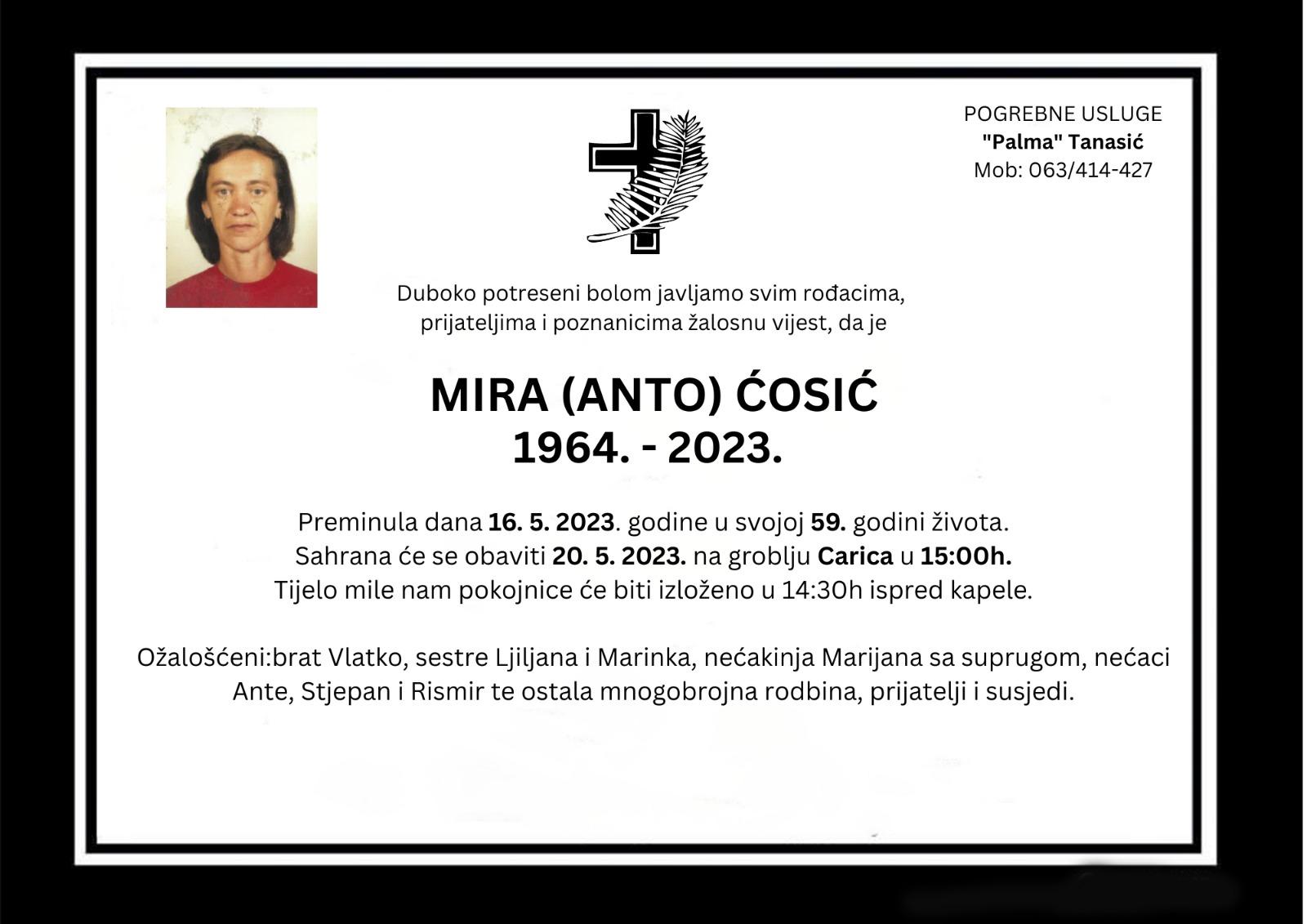 Mira (Anto) Ćosić preminula dana 16. svibnja 2023. godine u 59. godini života.