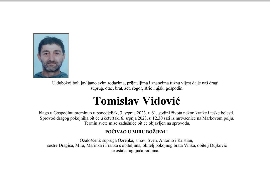 U dubokoj boli javljamo svim rođacima, prijateljima i znancima tužnu vijest da je naš dragi suprug, otac, brat, zet, šogor, stric i ujak, gospodin Tomislav Vidović blago u Gospodinu preminuo u ponedjeljak, 3. srpnja 2023. godine, u 61. godini života nakon kratke i teške bolesti.