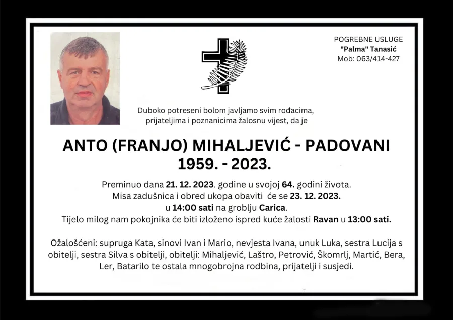 Duboko potreseni bolom javljamo svim rođacima, prijateljima i poznanciima žalosnu vijest, da je Anto (Franjo) Mihaljević – Padovani preminuo dana 21. 12. 2023. godine u svojoj 64. godini života.