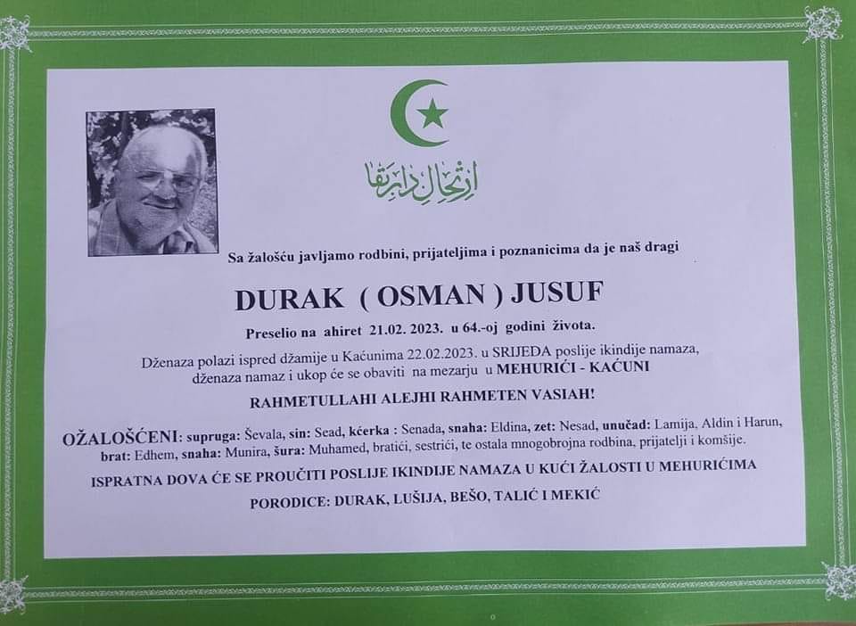 Sa žalošću javljamo rodbini, prijateljima i poznanicima da je naš dragi Durak (Osman) Jusuf preselio na ahiret 21. veljače 2023. godine u 64. godini života.
