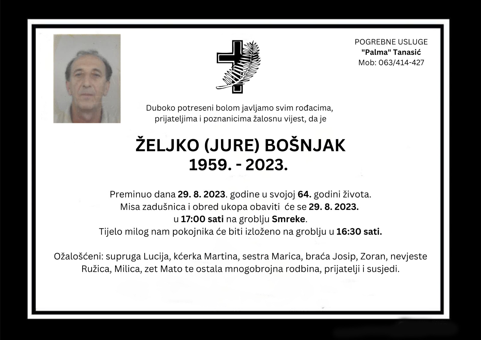 Misa zadušnica i obred ukopa obavit će se 29. kolovoza 2023. godine u 17 sati na groblju Smreke. Tijelo milog nam pokojnika će biti izloženo na groblju u 16 i 30 sati.