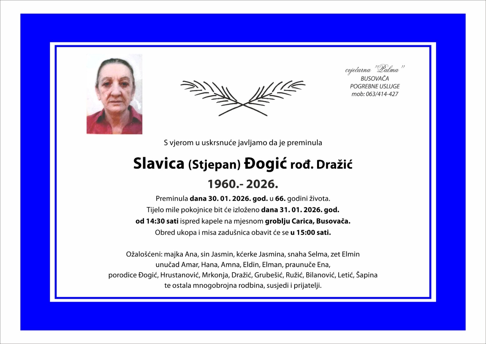 S vjerom u uskrsnuće javljamo da je preminula Slavica (Stjepan) Đogić rođ. Dražić (1960. – 2026.) dana 30. 01. 2026. god. u 66. godini života.