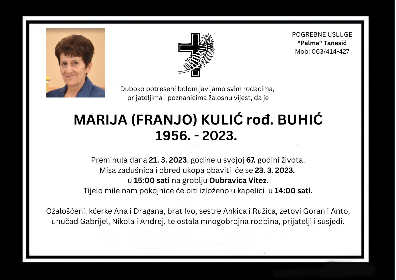 Duboko potreseni bolom javljamo svim rođacima, prijateljima i poznanicima žalosnu vijest, da je Marija (Franjo) Kulić rođ. Buhić preminula dana 21. ožujka 2023. godine u 67. godini života.