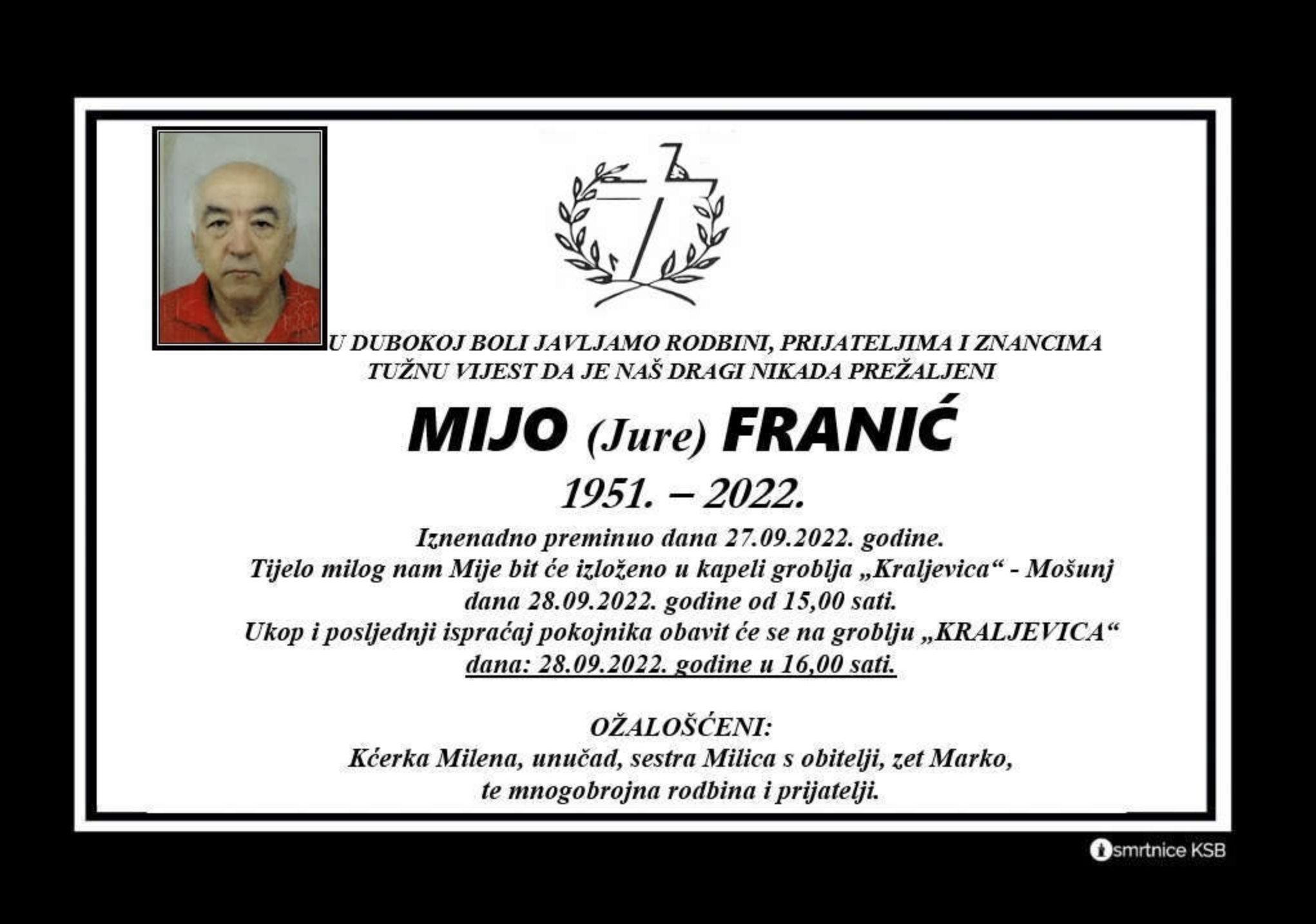 Tijelo milog nam Mije bit će izloženo u kapeli groblja “Kraljevica” Mošunj dana 28. rujna 2022. godine u 15 sati. Ukop i posljednji ispraćaj pokojnika obavit će se na groblju “Kraljevica” dana 28. rujna 2022. godine u 16 sati.