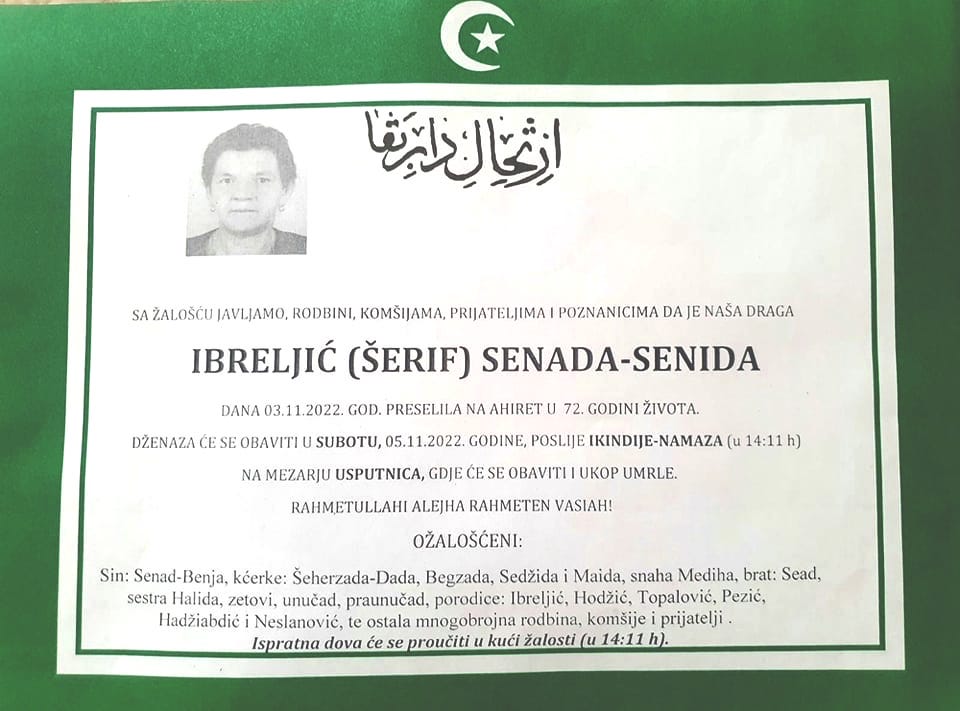 Sa žalošću javljamo robini, komšijama, prijateljima i poznanicima da je naša draga Ibreljić (Šerif) Senada-Senida preminula dana 3. 11. 2022. godine u 72. godini života.