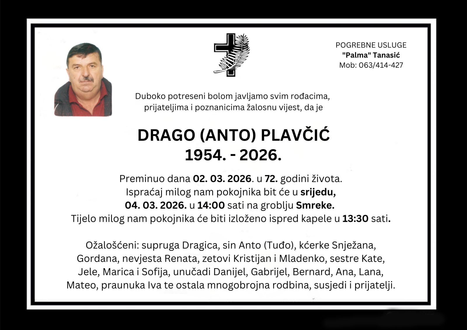 Duboko potreseni bolom javljamo svim rođacima, prijateljima i poznanicima žalosnu vijest, da je DRAGO (ANTO) PLAVČIĆ 1954. – 2026. preminuo dana 2. 3. 2026. u 72. godini života. Ispraćaj milog nam pokojnika bit će u srijedu, 4. 3. 2026. u 14:00 sati na groblju Smreke. Tijelo milog nam pokojnika će biti izloženo ispred kapele u 13:30 sati.