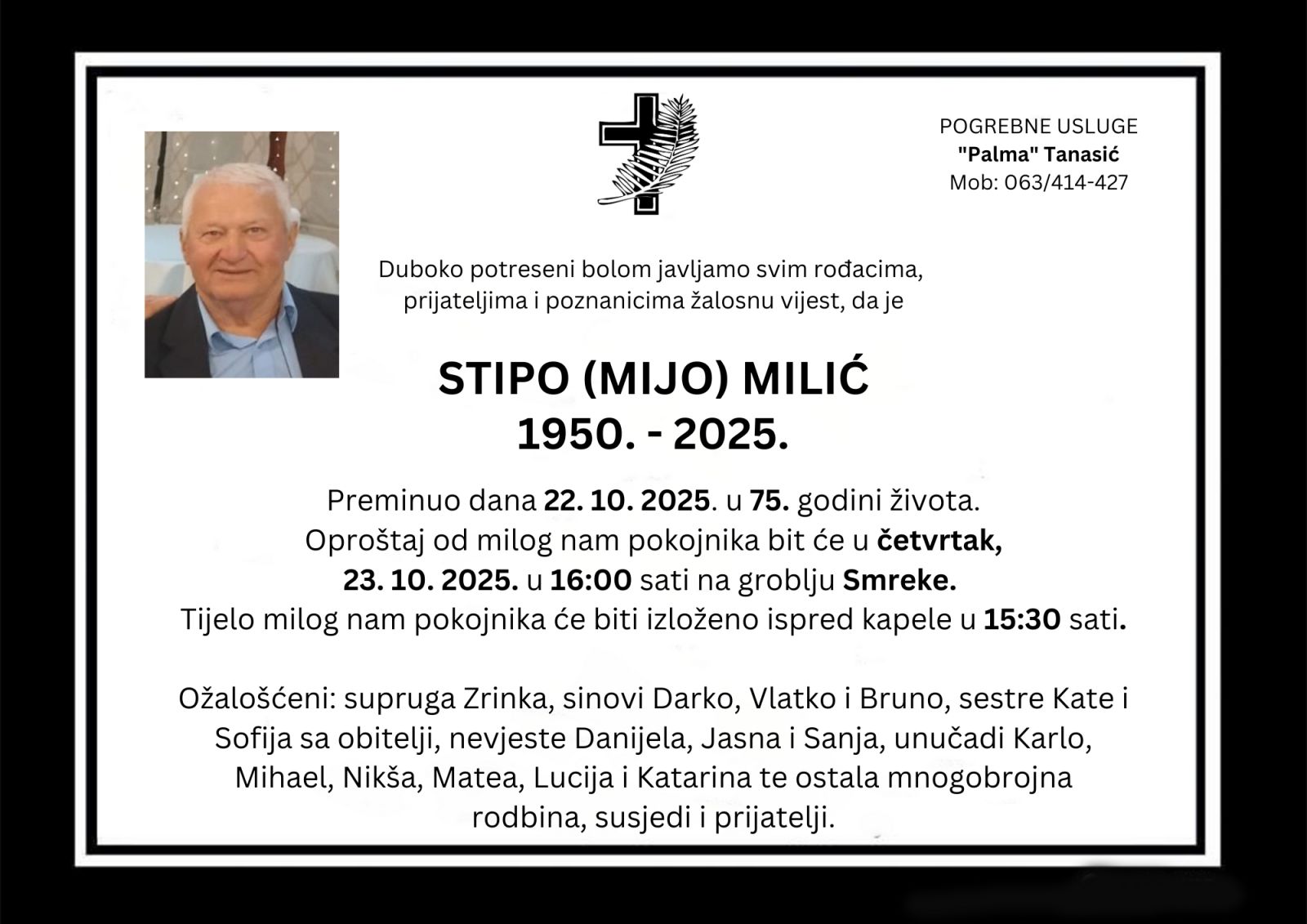 Duboko potreseni bolom javljamo svim rođacima, prijateljima i poznanicima žalosnu vijest, da je STIPO (MIJO) MILIĆ 1950. – 2025. preminuo dana 22. 10. 2025. u 75. godini života.
