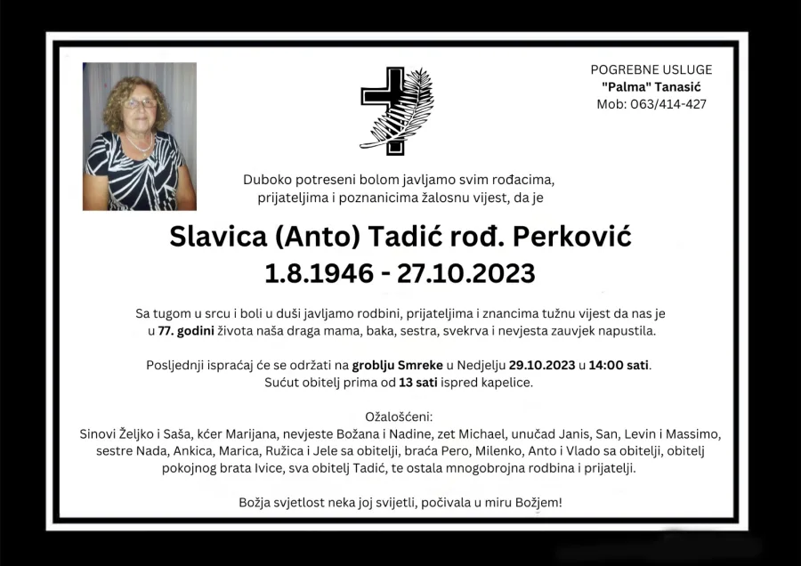 Duboko potreseni bolom javljamo svim rođacima, prijateljima i poznanicima žalosnu vijest, da je Slavica (Anto) Tadić rođ. Perković