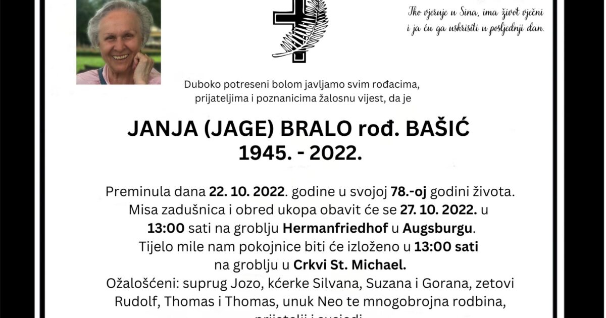 Duboko potreseni bolom javljamo svim rođacima, prijateljima i poznanicima žalosnu vijest da je Janja (Jage) Bralo rođ. Bašić preminula dana 22. listopada 2022. godine u svojoj 78. godini života. Misa zadušnica i obred ukopa obavit će 27. listopada 2022. godine u 13 sati na groblju Hermanfriedhof u Augsburgu. Tijelo mile nam pokojnice bit će izloženo … Nastavi čitati U 78. godini života preminula Janja Bralo rođ. Bašić