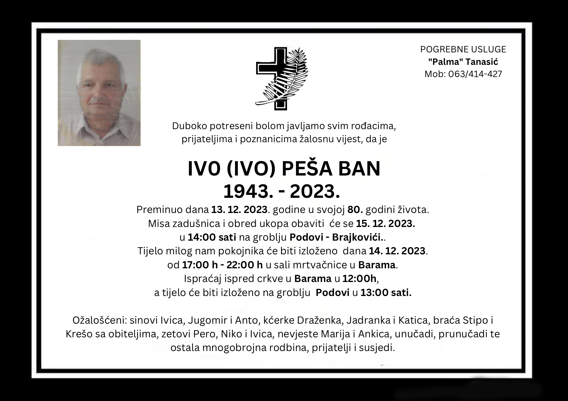 Duboko potreseni bolom javljamo svim rođacima, prijateljima i poznanicima žalosnu vijest, da je IVO (IVO) PEŠA BAN preminuo dana 13. 12. 2023. godine u svojoj 80. godini života.