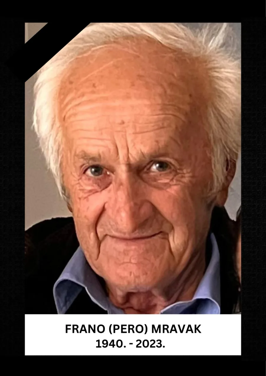 Duboko potreseni bolom javljamo svim rođacima, prijateljima i poznanicima žalosnu vijest, da je FRANO (PERO) MRAVAK reminuo nakon kraće bolesti dana 30. 12. 2023. godine u svojoj 84. godini života.