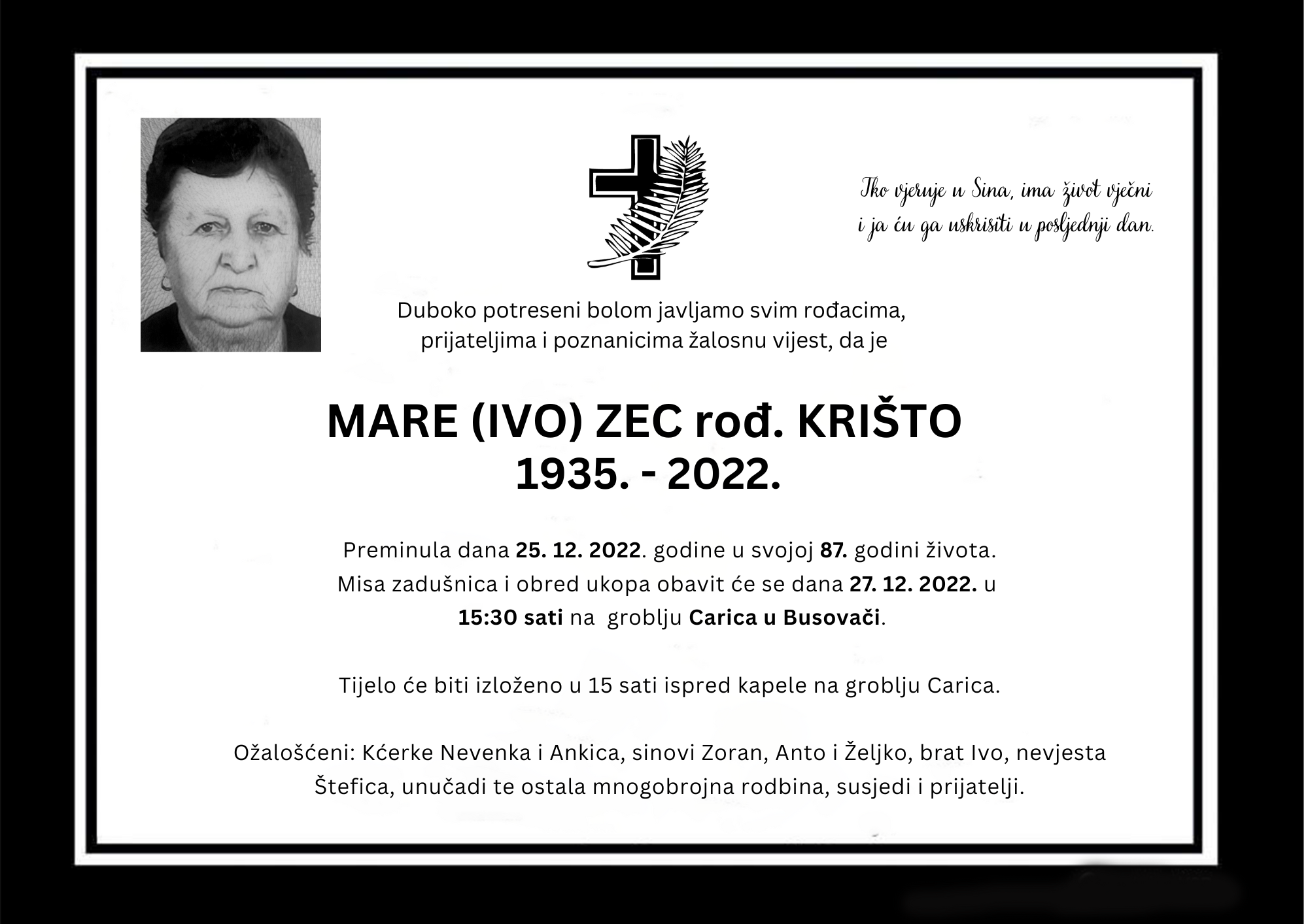 Mare (Ivo) Zec rođ. Krišto preminula dana 25. prosinca 2022. godine u svojoj 87. godini života.