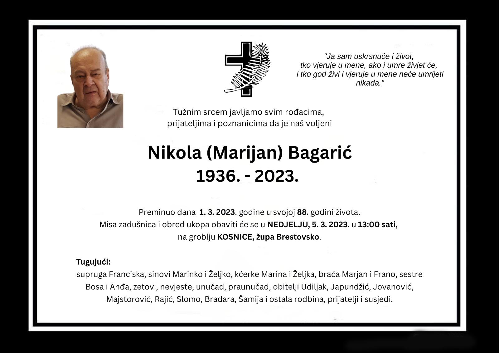 Tužnim srcem javljamo svim rođacima, prijateljima i poznanicima da je naš voljeni Nikola (Marijan) Bagarić preminuo dana 1. 3. 2023. godine u svojoj 88. godini života.