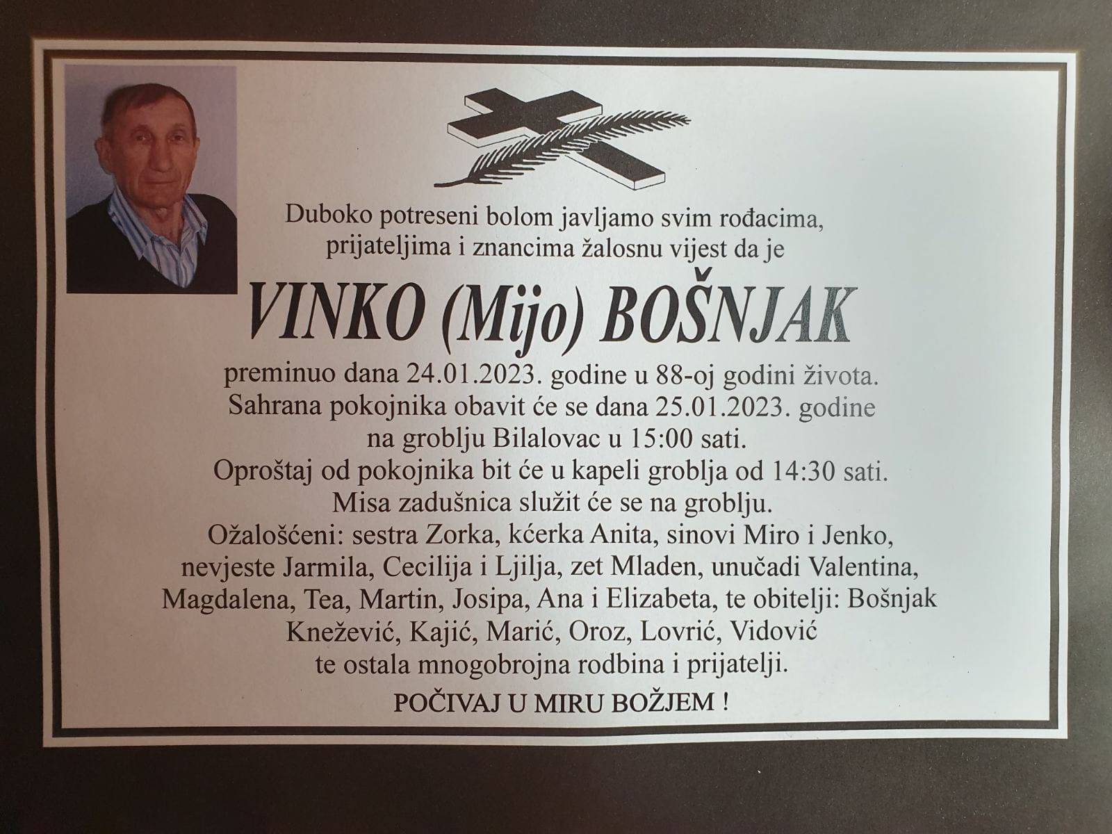 Duboko potreseni bolom javljamo svim rođacima, prijateljima i znancima žalosnu vijest da je Vinko (Mijo) Bošnjak preminuo dana 24. siječnja 2023. godine u 88. godini života.