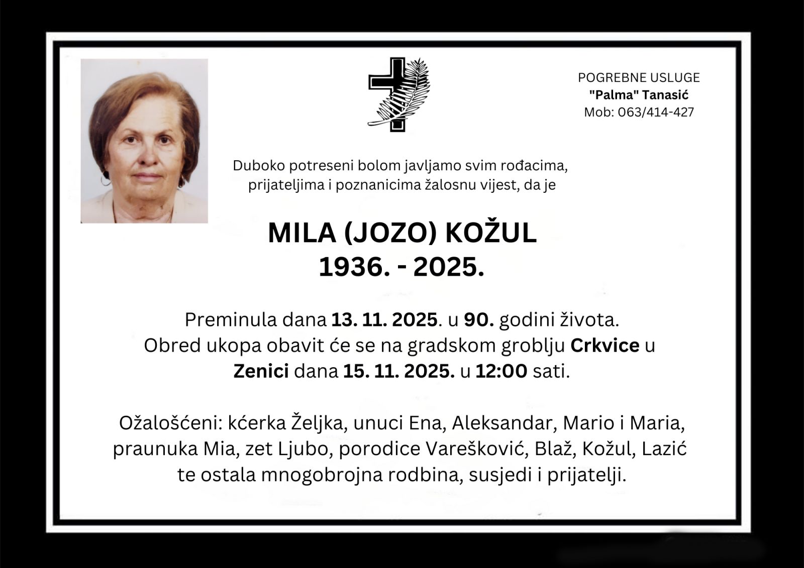 Duboko potreseni bolom javljamo svim rođacima, prijateljima i poznanicima žalosnu vijest, da je MILA (JOZO) KOŽUL 1936. – 2025. Preminula dana 13. 11. 2025. u 90. godini života.