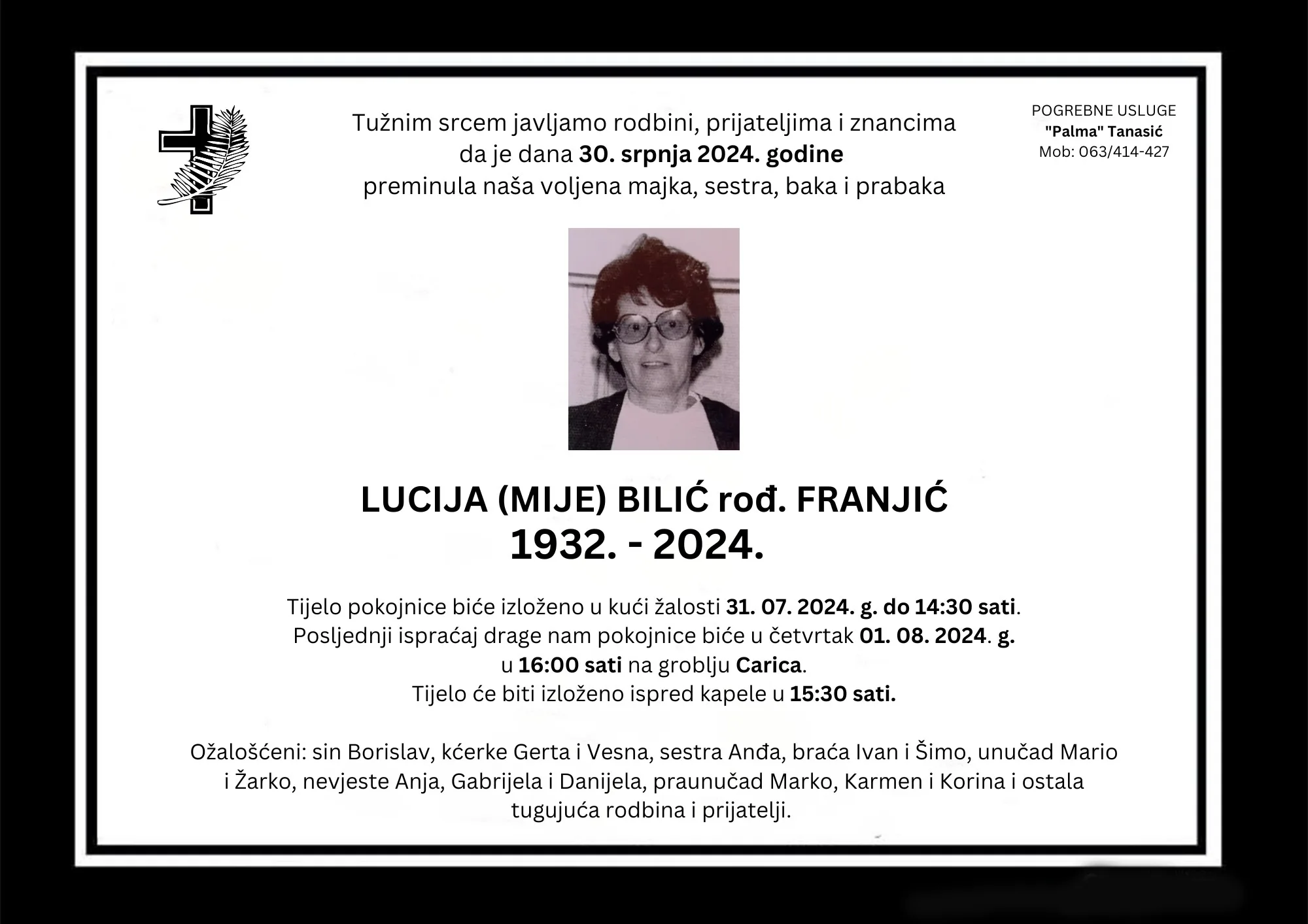 Tužnim srcem javljamo rodbini, prijateljima i znancima da je dana 30. srpnja 2024. godine preminula LUCIJA (MIJE) BILIĆ rođ. FRANJIĆ u svojoj 92. godini života.