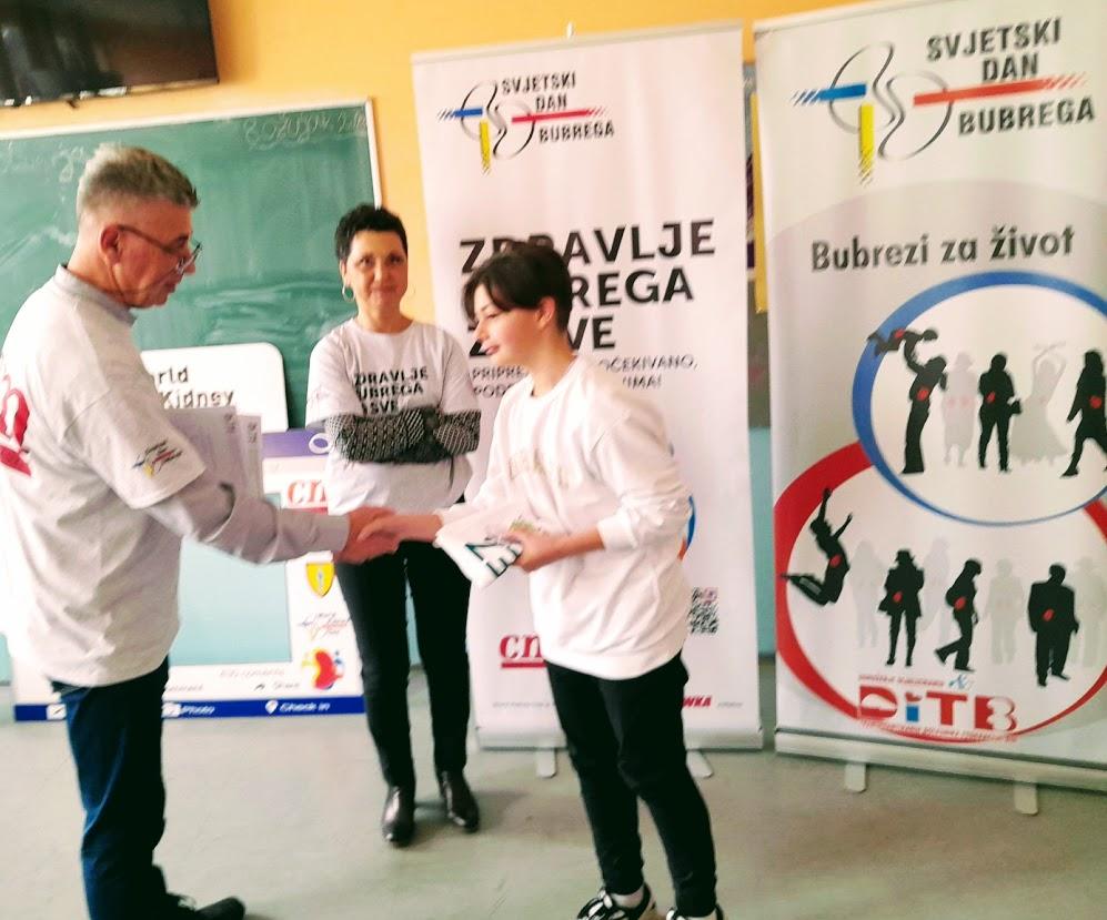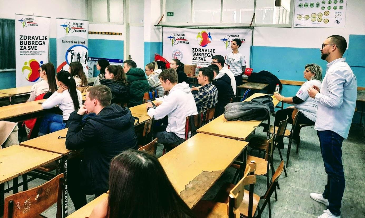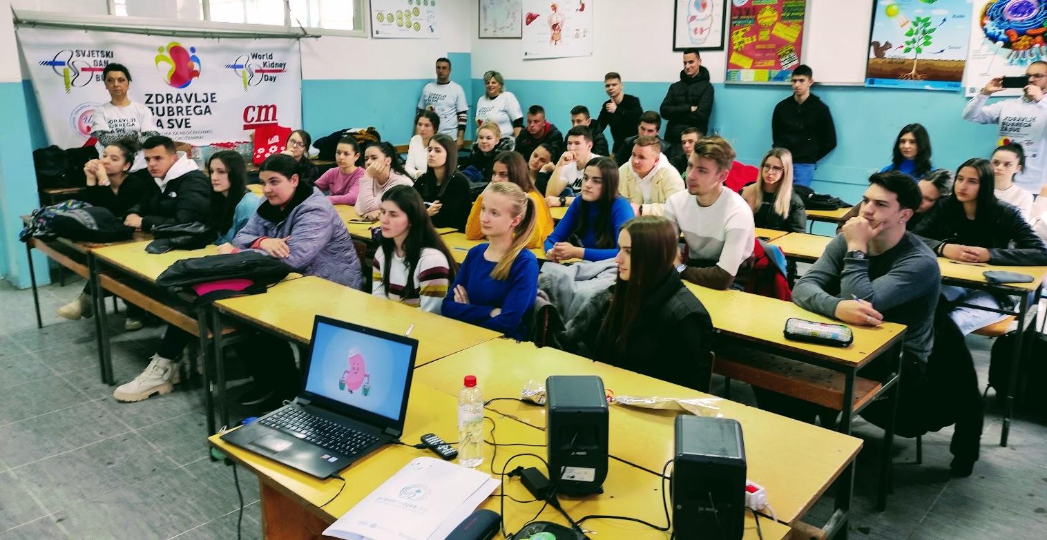 Članovi naše Udruge učenicima srednje I osnovne škole kroz kratki edukatvini film I prezentaciju o bubrezima prenijeli glavne informacije o ovom čudesnom organu kojega u Japanu zovu I drugo srce. Naglasili smo važnost tjelesne aktivnosti, pravilne prehrane te kontrole tjelesne težine, krvnog tlaka I šećera u krvi koji su glavni uzeočnici bolesti bubrega. Dotakli smo se I dijalize I transplantacije kao dva načinalijelnja bubrežne bolesti. U interaktivnoj komunikaciji, učenici su saznali I da bubrezi za sata profiltriraju 200 lit krvi, da čovjek može živjeti sa samo jednim bubregom, I da je bubreg zadužen I za vitamin D , kosti, crvena krvna zrnca te da se sve što nije za vraćanje u krvotok, te otpadne tvari se izbacuju putem urina. Naglasili smo I važnost uzimanja dovoljno vode u tjeku dana, izbjegavanje uzimanja gaziranih sokova I pušenja itd.