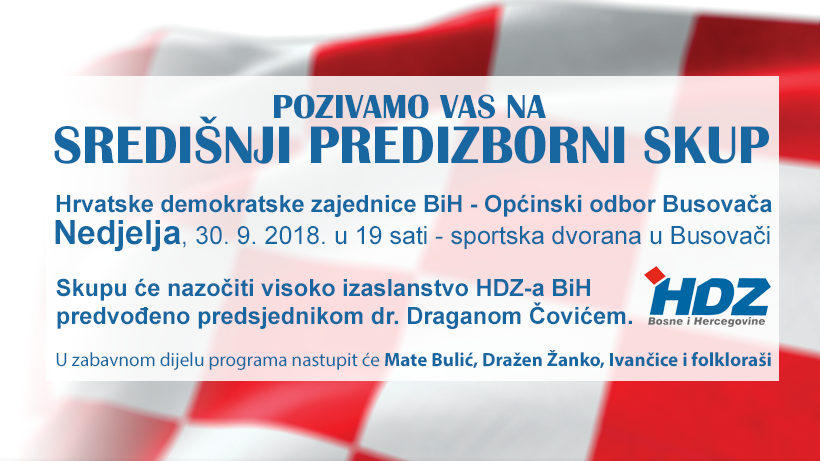 Poštovani članovi, simpatizeri, dragi prijatelji, zadovoljstvo nam je pozvati Vas na Središnji predizborni skup HDZ BiH Busovača koji će se održati u nedjelju, 30. rujna 2018. godine, s početkom u 19 sati u športskoj dvorani Srednje škole „Busovača“.