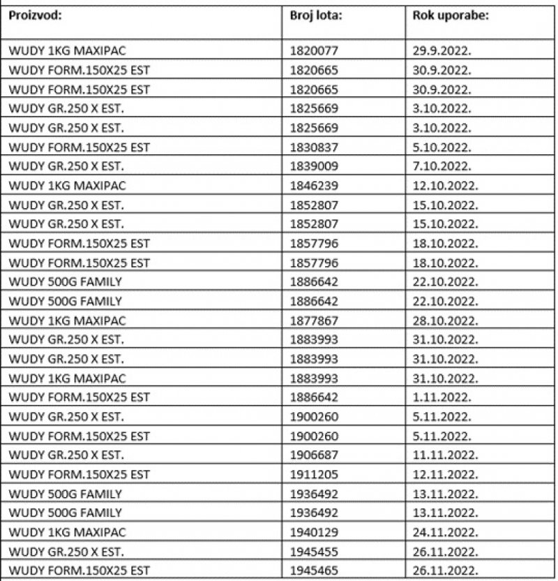 Radi se o proizvodima brenda “Wudy” čiji je proizvođač “Agricola Tre valli Soc.Coop.A.R.L.”, P.le A.Veronesi 1 S.Martino B.A., Italija