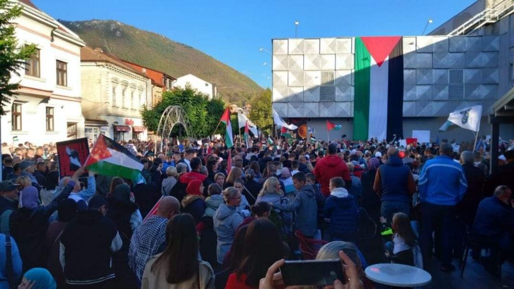Veliki broj građana Travnika danas je noseći zastave Palestine i antiratne parole poslao poruku podrške narodu u Gazi.